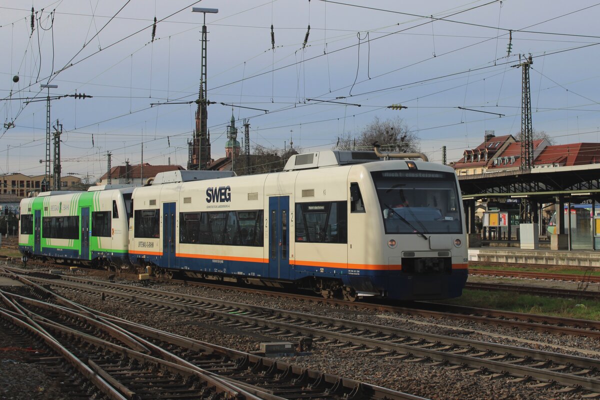 SWEG, ex-BSB 019/650 048 steht -noch immer mit Breisgauer S-Bahnfarben- am 15 Febtruar 2024 in Offenburg.