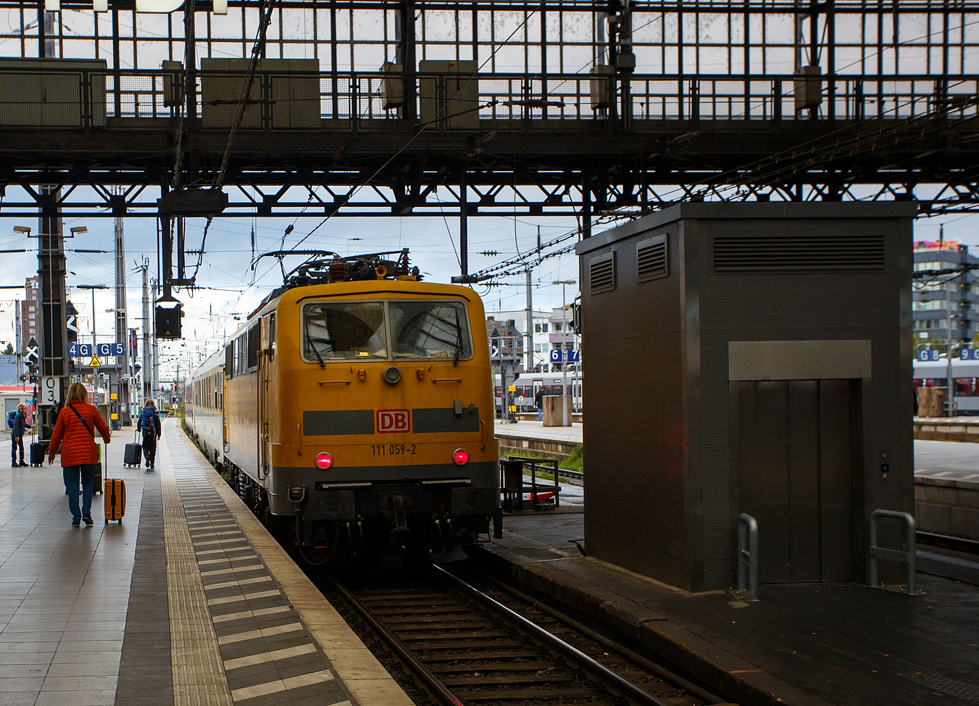 Die 111 059-2 (91 80 6111 059-2 D-DBMP) der DB InfraGO AG, ex DB Netz AG / DB Netz Instandhaltung – Fahrwegmessung am 21 Oktober 2025, mit einem Messzug der DB Systemtechnik GmbH (Minden/Westf.), im Hauptbahnhof Köln.