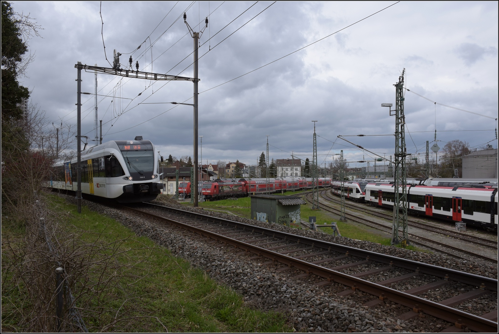 Die Abstellanlage des Bahnhof Konstanz auf Kreuzlinger Germarkung ist gut belegt. Von links 146 231 ohne einen streikenden Dosto-Steuerwagen, dafür mit 146 237(?) als Sandwich. 4010 005, versteckt RABe 521 208 'Singen', hintereinander RABe 521 203 und RABe 521 207, 146 239 und 146 230 jeweils mit Schwarzwaldbahnzug. März 2023.