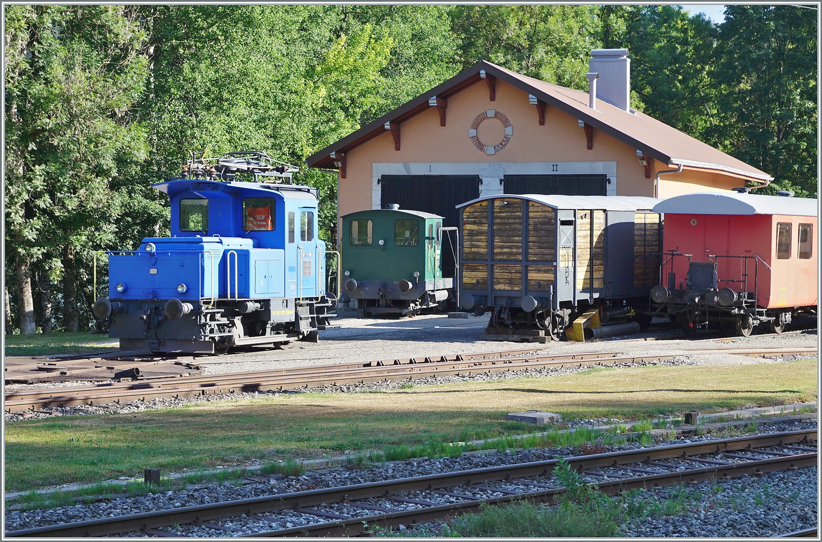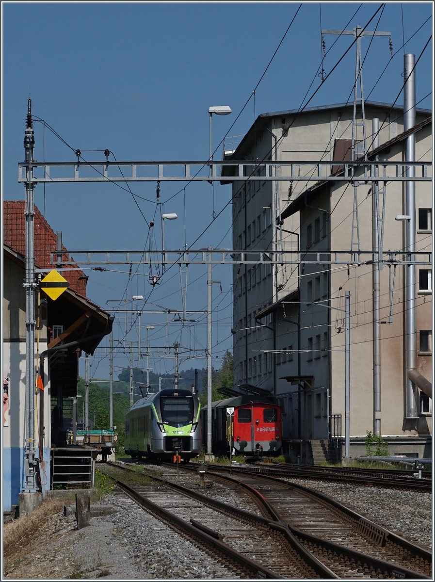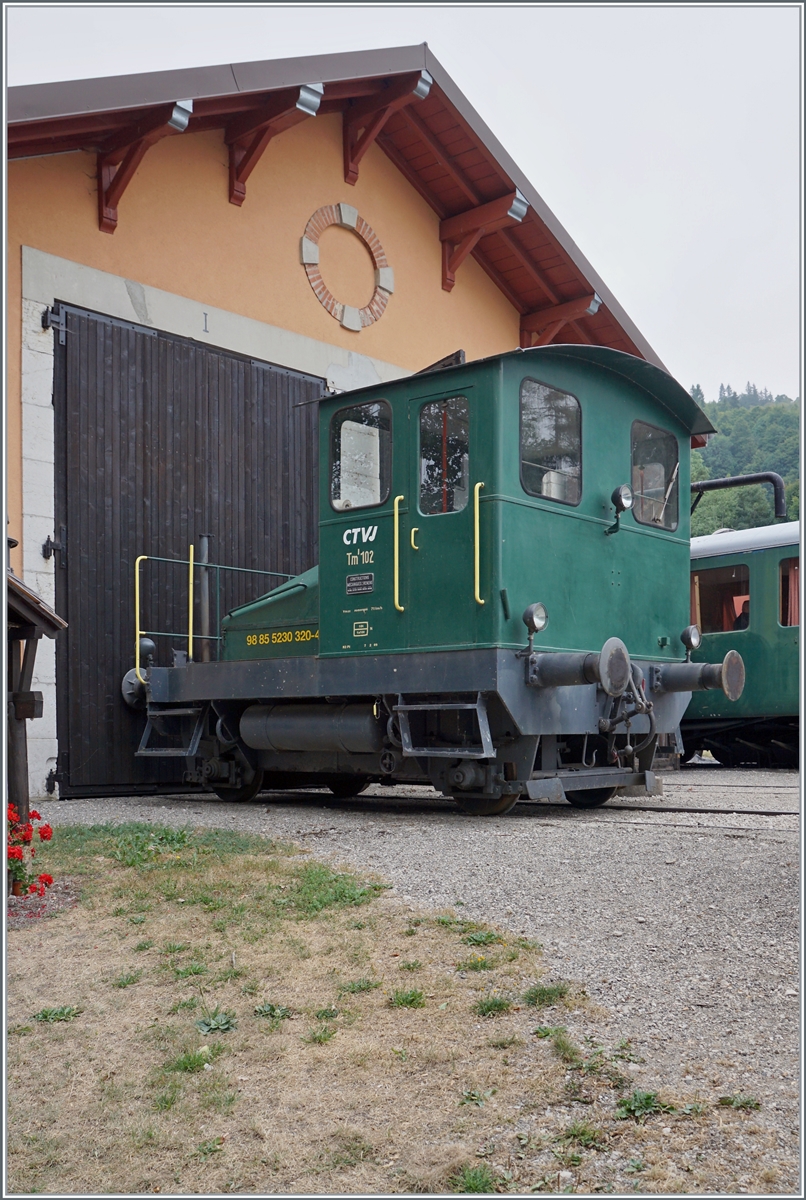 Der Landi Tm I an der Rampe des Lagerhauses in Les Hauts-Geneveys; rechts im Bild der an die TransN vermietet RABe 523 074.