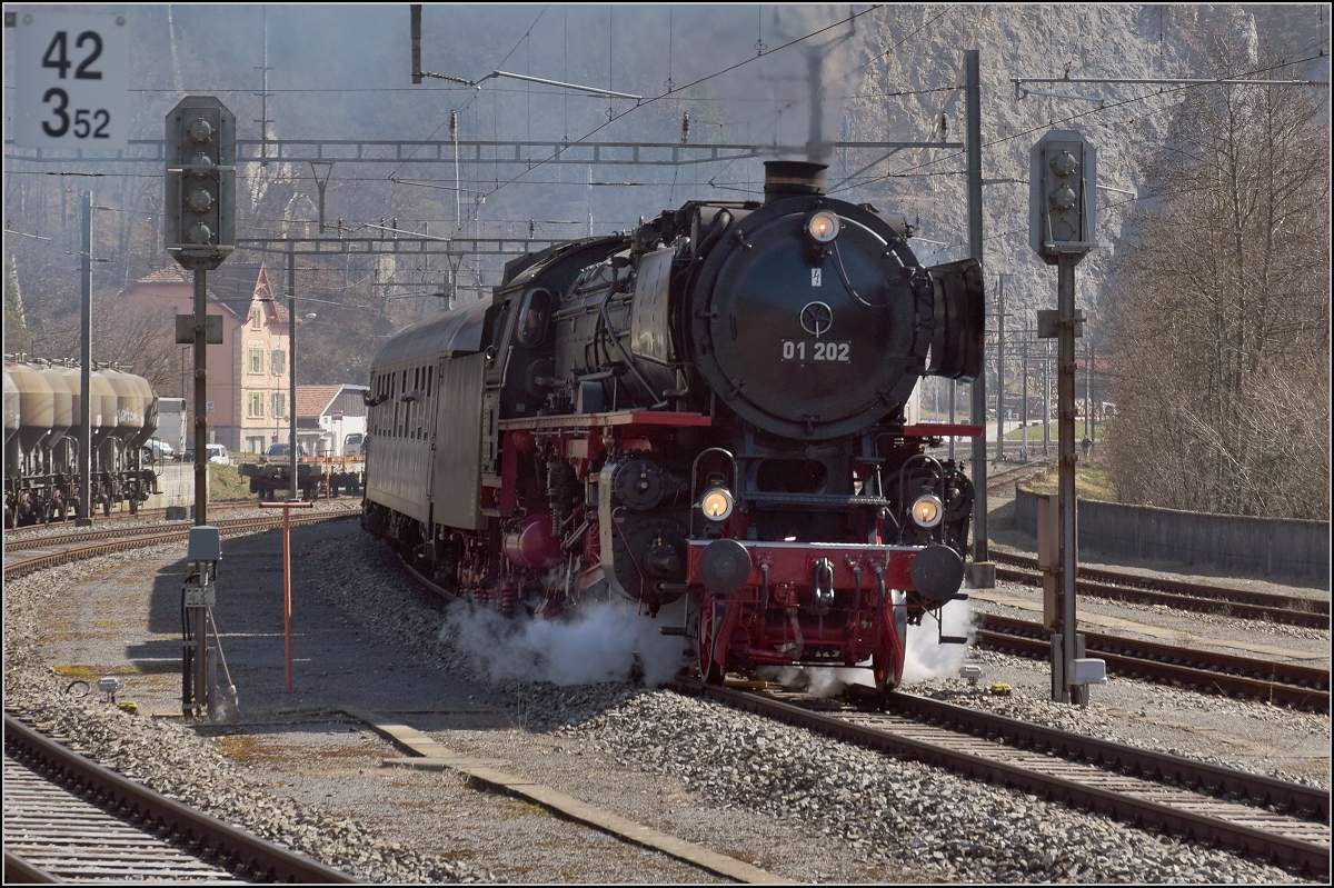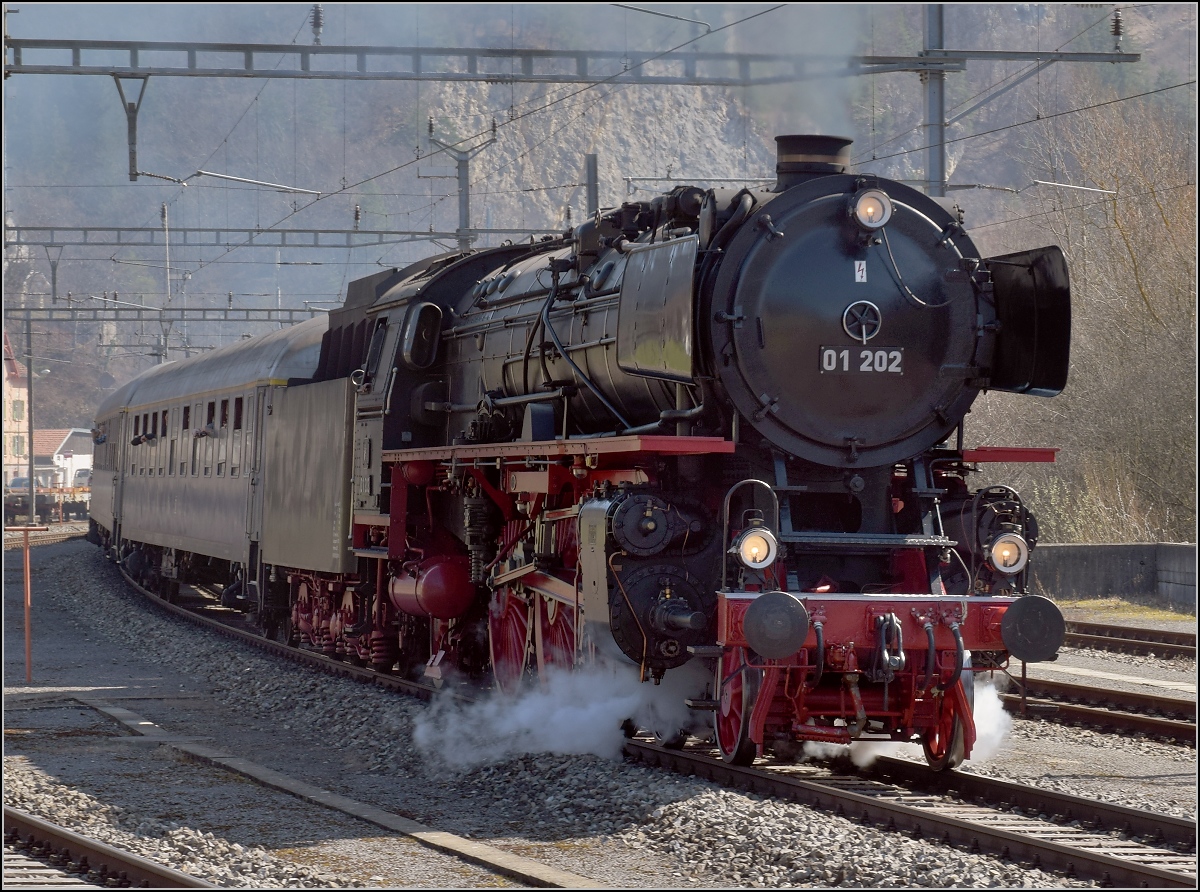 IGE-Abschiedsfahrt vom "Blauen Fernschnellzug". 01 202 bei der Durchfahrt von Reuchenette-Péry. März 2019.