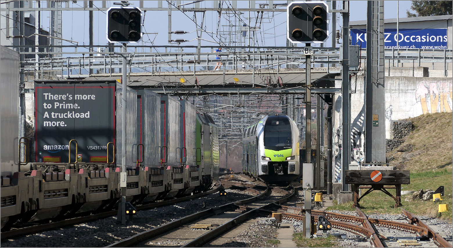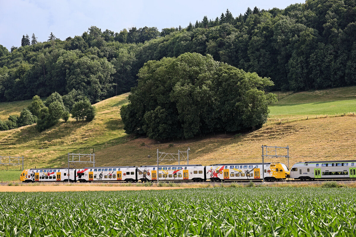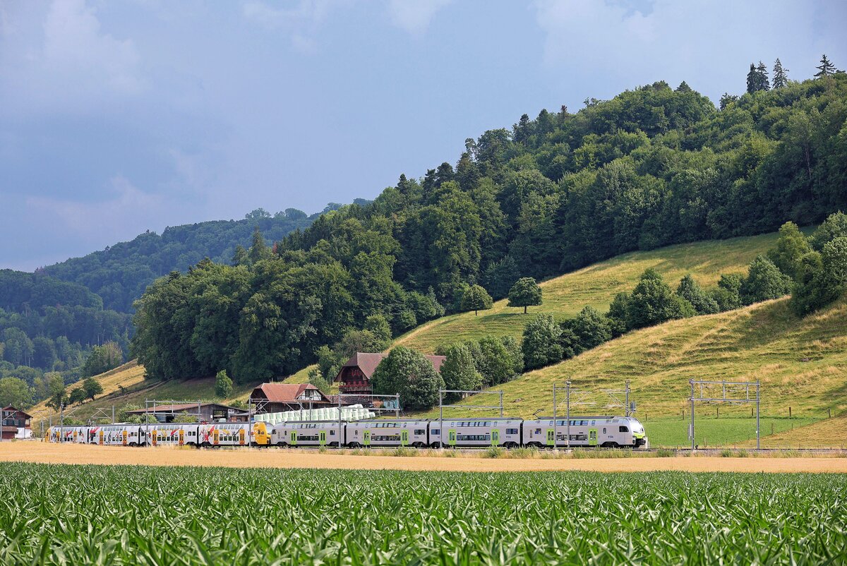 Vectron 193 718 der MRCE begegnet RABe 515 019 und RABe 515 038 bei Bollodingen. September 2022.