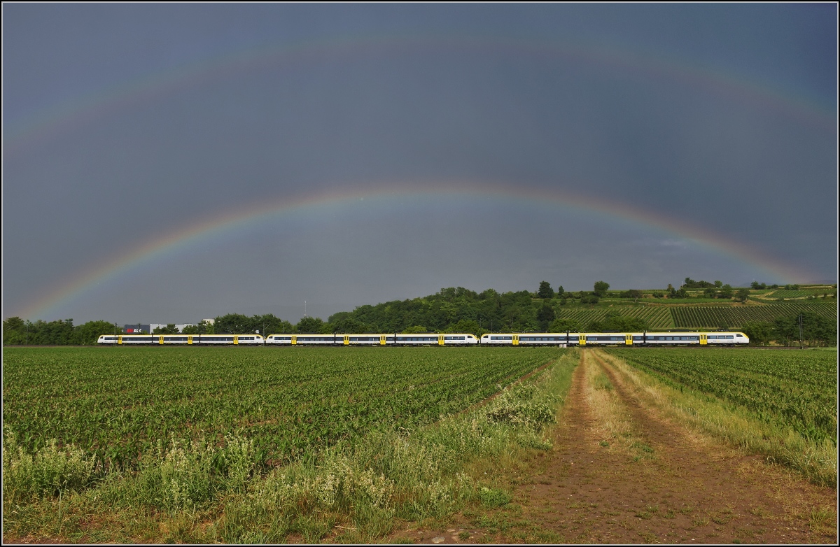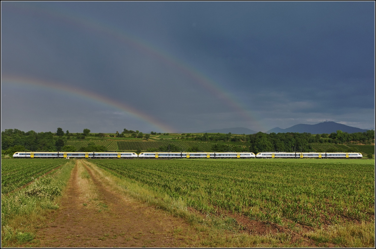 463 018 + 463 007 + 463 005 mit doppeltem Regenbogen bei Buggingen. Juni 2022.