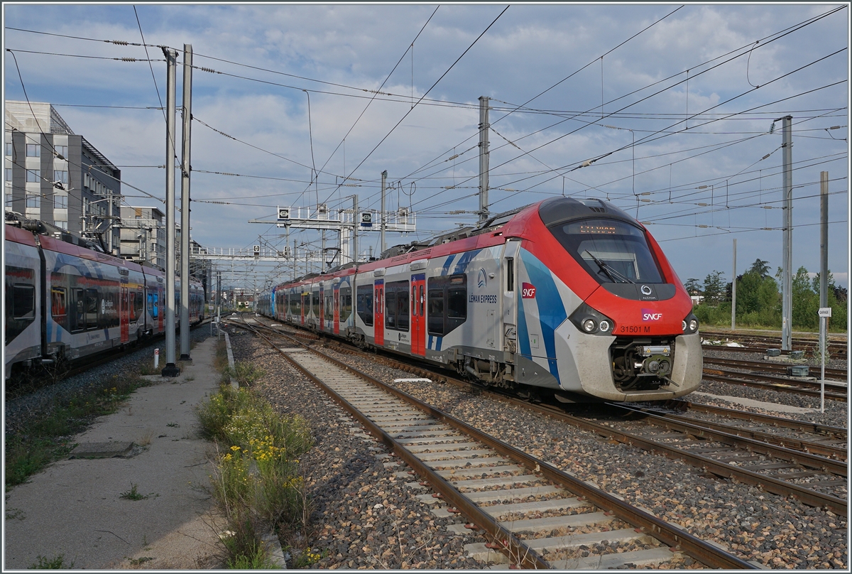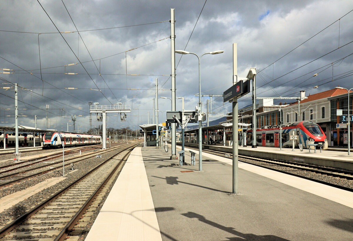 Der SBB RABe 522 verlässt an einem typischen SNCF Signal vorbei Annemasse.