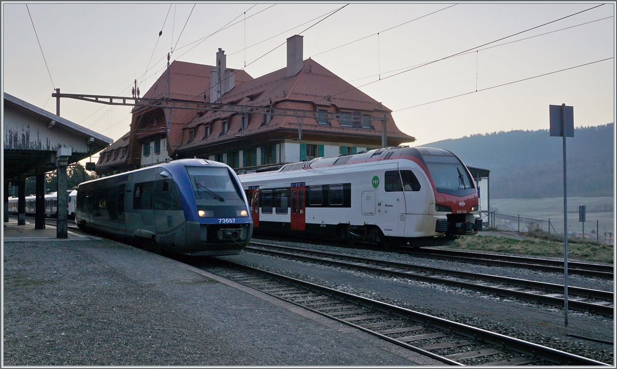 er SNCF X 73755 verlässt als TER 18136 nach Frasne den Bahnhof von Vallorbe. Der Dieseltriebwagen verkehrte vorgängig bei der "Ligne des Horlogers" (Besançon - Le Locle), ist dort aber durch dreiteilige Triebzüge ersetzt worden.