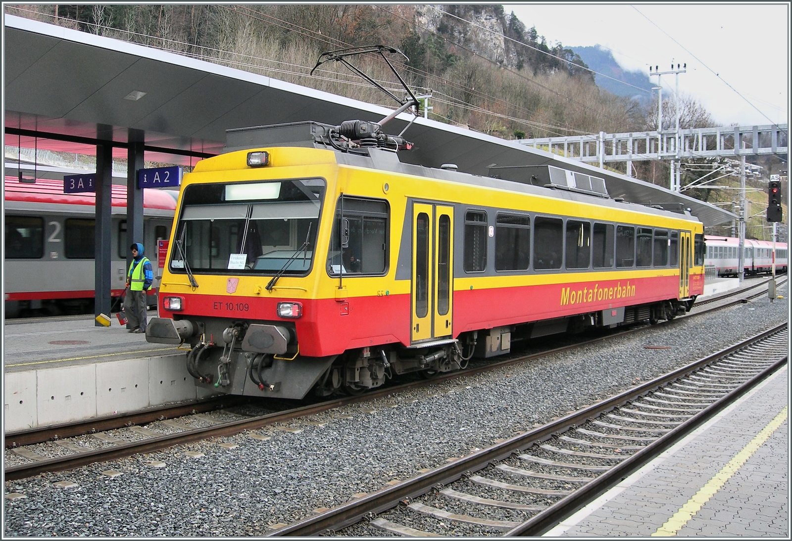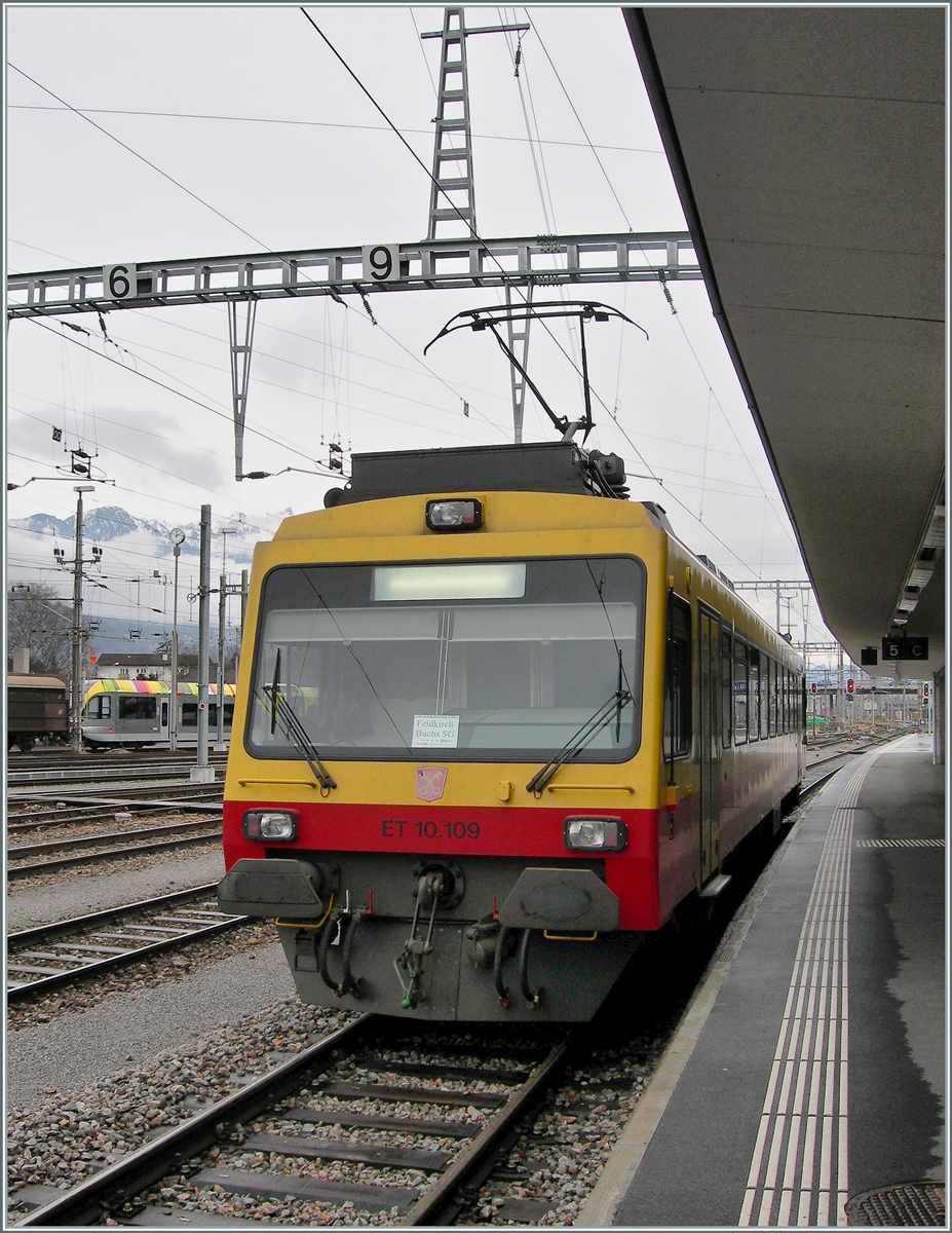 Grenzbild - Schweizer Berge im Hintergrund, schweizer Ufer links, lichtensteiner Ufer rechts und auf der Brücke die österreichische 1116 222 'RED BULLETiN', die den RJ 169, Zürich-Wien, über die Grenze schiebt. Fotostandpunkt: Kiesbank im Rhein bei Buchs am 07.03.2014.