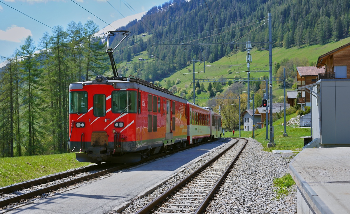 Steuerwagen voraus (ABt 4153, Typ SIG1 Baujahr 1972) erreicht der Regionalzug von Andermatt nach Visp der Matterhorn-Gotthard-Bahn (MGB) am 25.05.2023 den Bahnhof (Vorplatz) Brig. Schubtriebfahrzeug war der Gepäcktriebwagen Deh 4/4 II - 96 "Münster ".