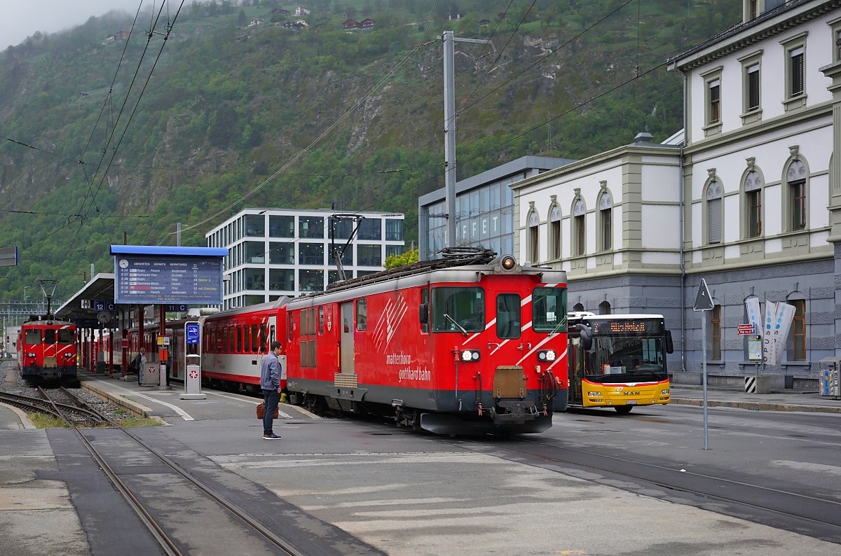 Baubedingte Sperrung der Simplonstrecke zwischen Iselle und Domodossola: Die SBB Re 4/4 II 11161 wartet mit ihrem IR in Brig auf die Abfahrt nach Iselle, wo dann auf einen Autobus umgestiegen werden muss) Der Zug besteht aus folgenden Reisezugwagen: A 50 85 18 35 028-1, B 5085 20 35 265-1, B 50 85 20 316-2 und dem BDt 50 85 82 33 923-2 an der Zugsspitze.