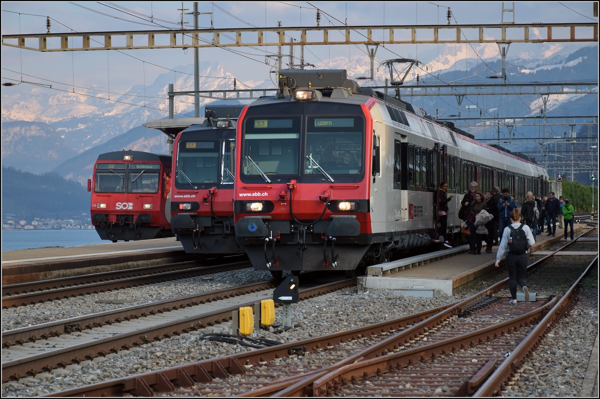 Blick auf die Trennstelle, nach links verlässt ein NPZ die Hauptstrecke und nutzt den Seitenast der Gotthardbahn nach Luzern. Von hinten kommt die Hauptstrecke der Gotthardbahn, vielmehr beginnt im Rücken des Fotografen, während die Gleise nach rechts das Ende der aargauischen Südbahn darstellen. Immensee, März 2019.