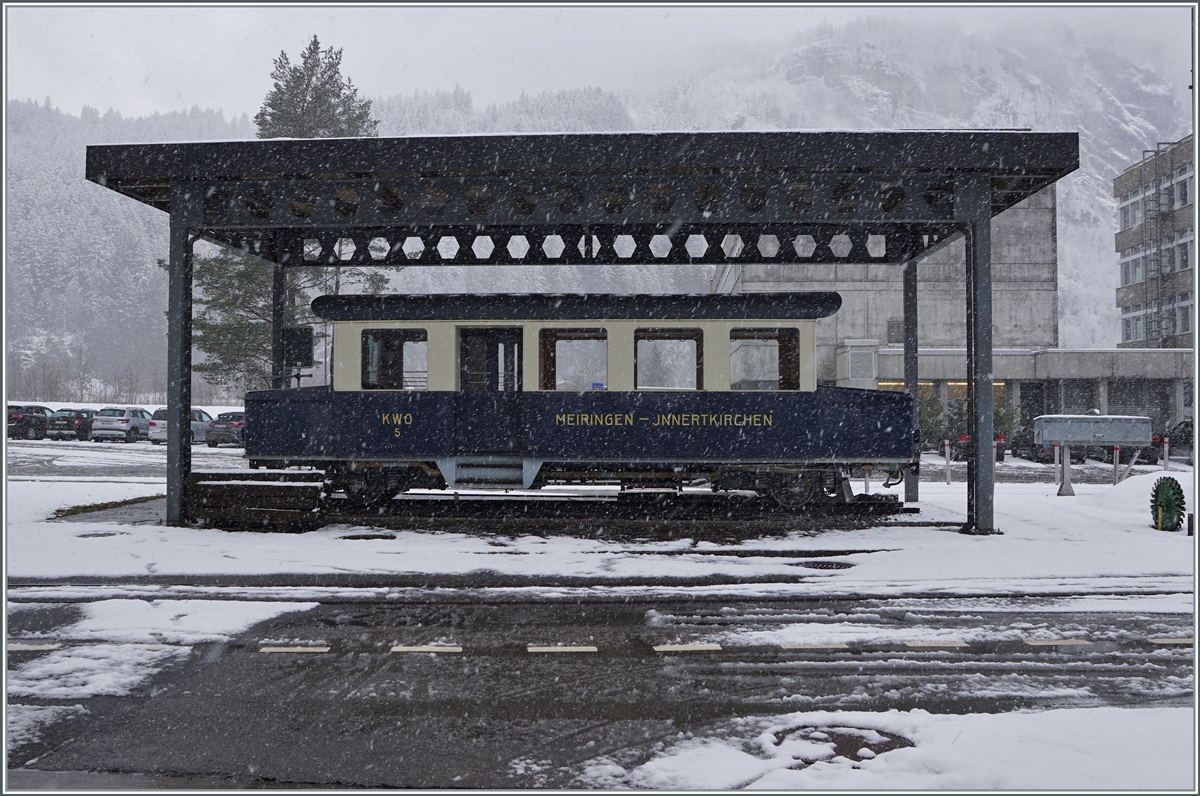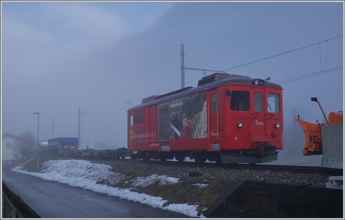 Der MIB BDe 4/4 11 und ein Zentralbahn Dienstwagen (ex Gepäckwagen) stehen in Innertkichen.