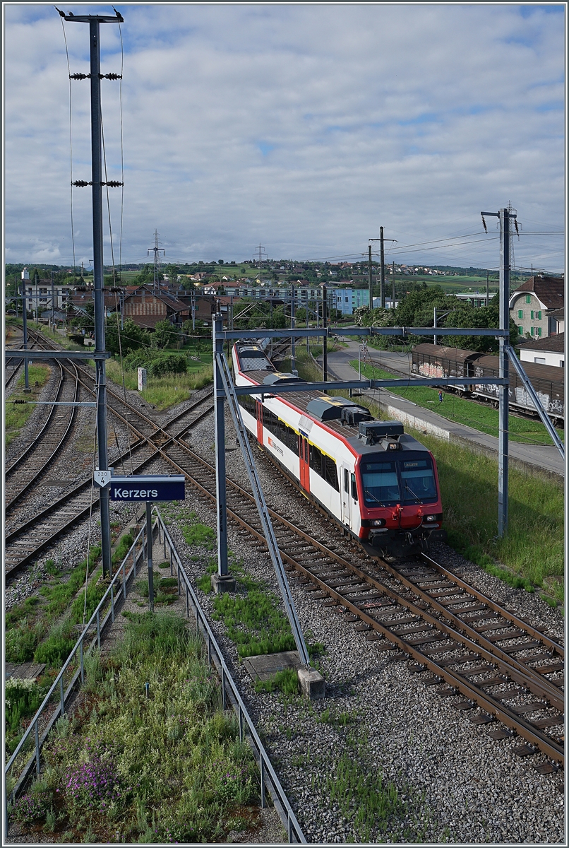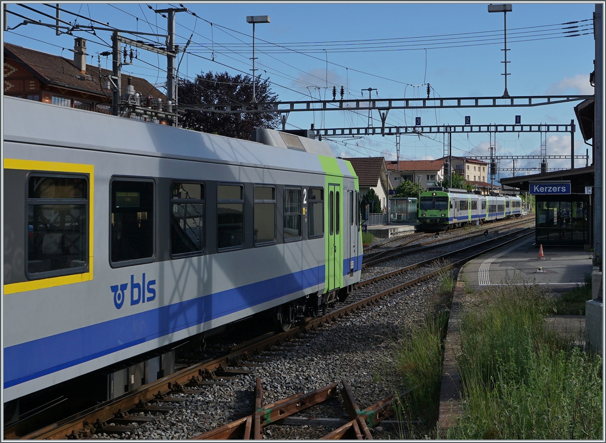 Der BLS 528 105 verlässt als IR nach Bern den Bahnhof Kerzers. Das Zugsanzeigeschild zeigt bereits den Gegenzug nach Neuchâtel an.