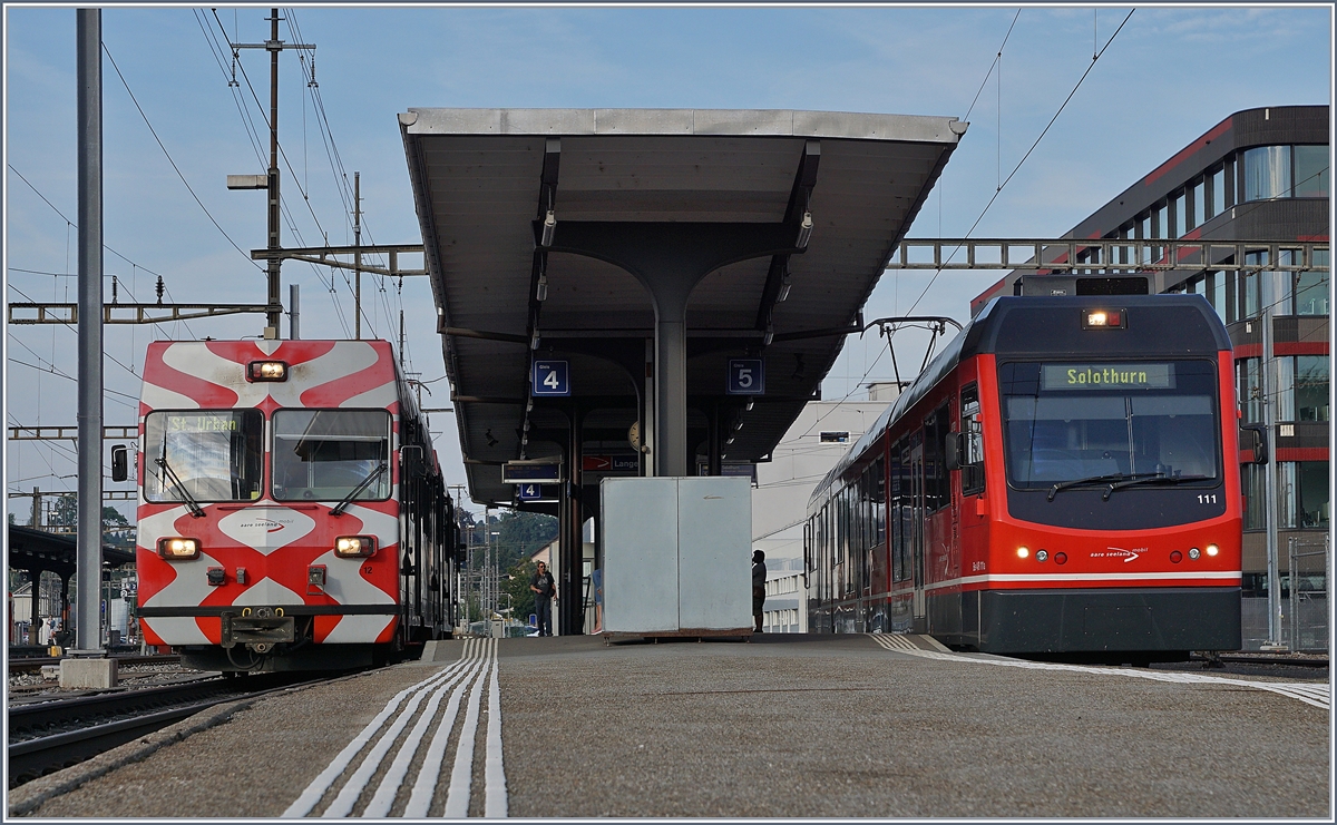 De 4/4 121 der Asm ist ausgerüstet mit großen Puffern, um aufgebockte Normalspur Güterwägen besser bedienen zu können. Gerade wird in das Asm-Depot Langenthal nach getaner Arbeit rangiert. Dezember 2016.