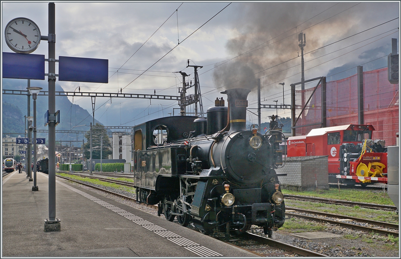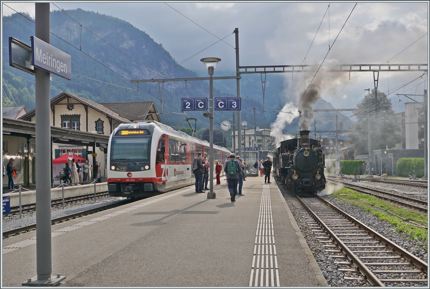 Der Extrazug wird in Meiringen auf Gleis vier von SBB HGe 4/4 I N° 1992 "Giswil abgestellt.