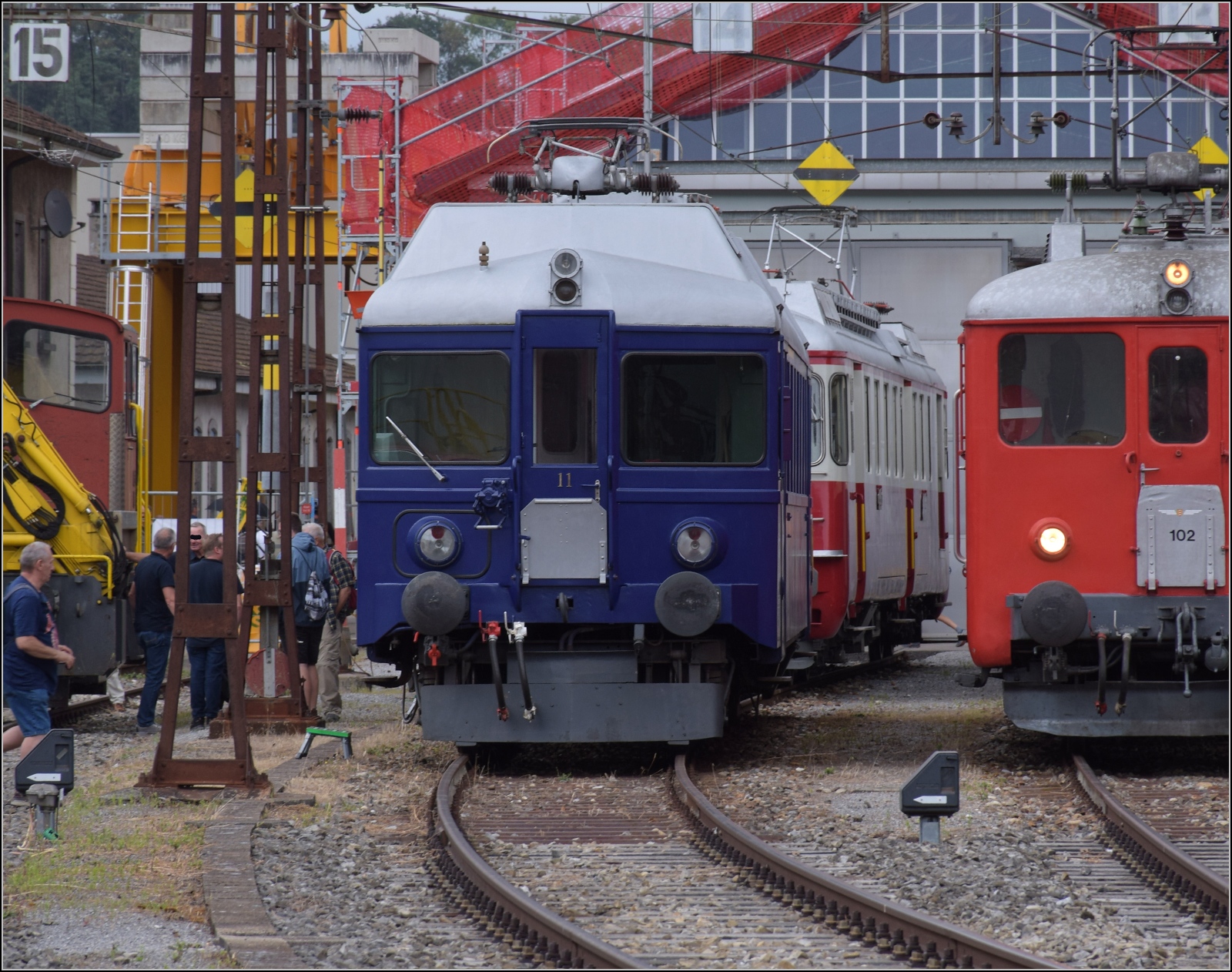 Der BCFZe 4/6 der BLS im funktionellen Design ist einer der Stars der Ausstellung, er fällt auch von weitem auf. August 2023.