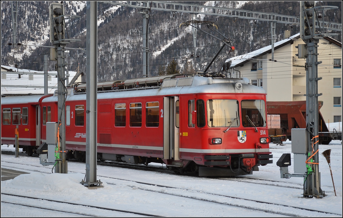 Über dem Bahnhof Pontresina leuchten die Berge zwischen Unterengadin und Oberengadin. Januar 2020.