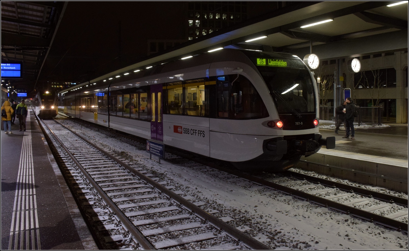 RABe 526 757 in St. Gallen. Dahinter entschwindet gerade RABe 526 779 und macht Platz für meinen Direktzug nach Hause. Februar 2023. Olli