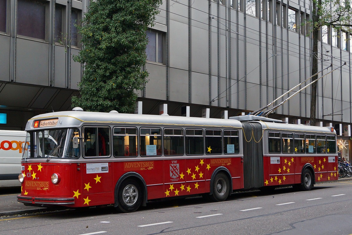 Stadtbus Winterthur: FBW Museumstrolleybus 101 als Adventsbus, aufgenommen am 10. Dezember vor dem MANOR-Kiosk Winterthur. Da die Trolleybusse in der Schweiz dem Eisenbahngesetz unterstehen, wird diese Aufnahme in diesen Kategorien gezeigt.