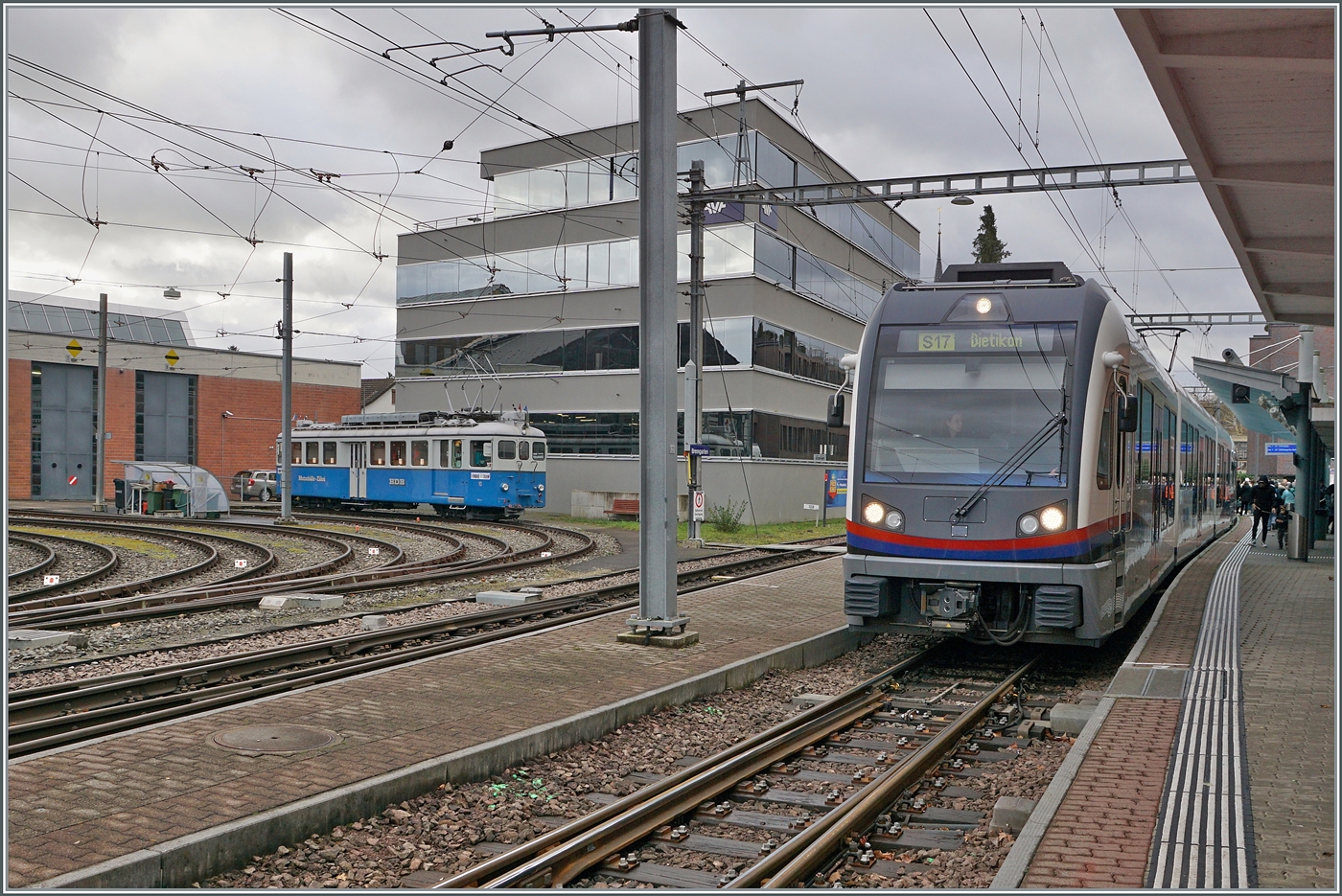 Da mit dem gehoben Stromabnehmer fotogener, noch einmal der BD BDe 8/8 N° 1 in Wohlen, der als Regionalzug 663 auf die Abfahrt nach Dietikon wartet.