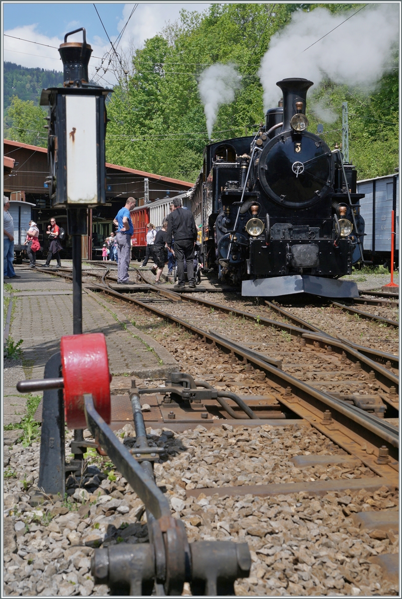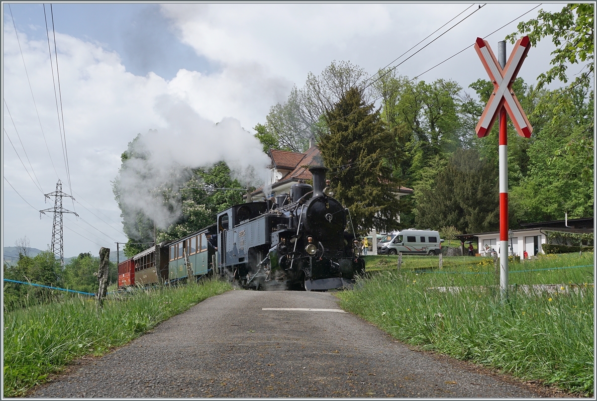 50 Jahre BC - MEGA STEAM FESTIVAL der Museumsbahn Blonay–Chamby: Ein Höhepunkt war am Samstag (19.05.2018) der von gleich sieben Dampfloks gezogene Zug von Blonay nach Chamby, der hier nun bald Chamby erreicht.