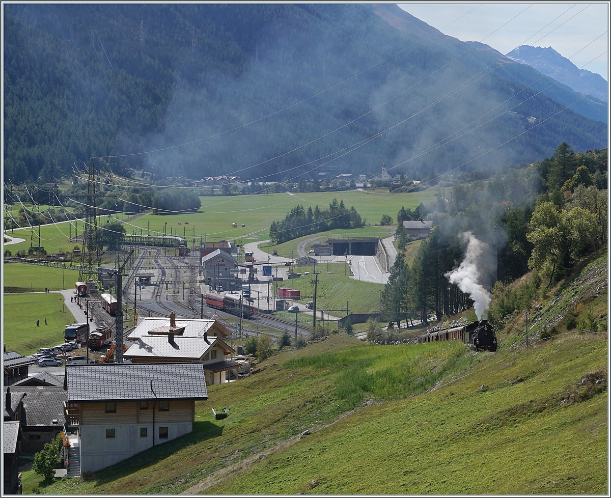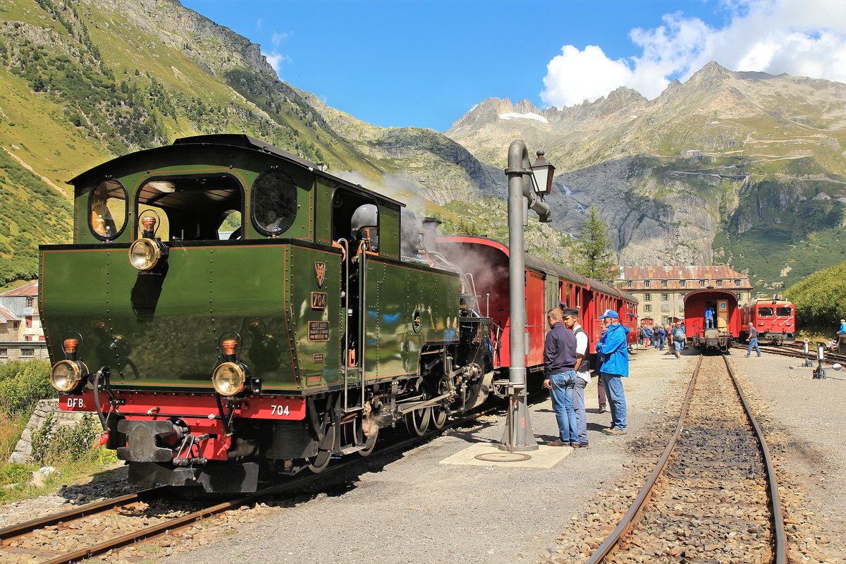 Der Stargast des heutigen Festtages: die HG 4/4 704 (ex 40-304 der Vietnamesischen Eisenbahn) ist mir ihrem Zug in Gletsch eingetroffen und rangiert nun für die Fahrt nach der Station Furka.