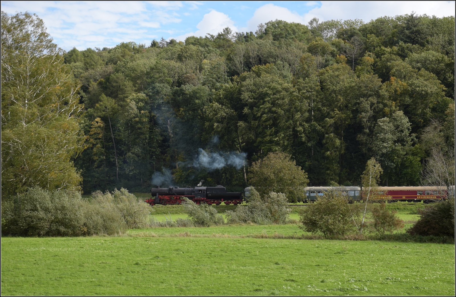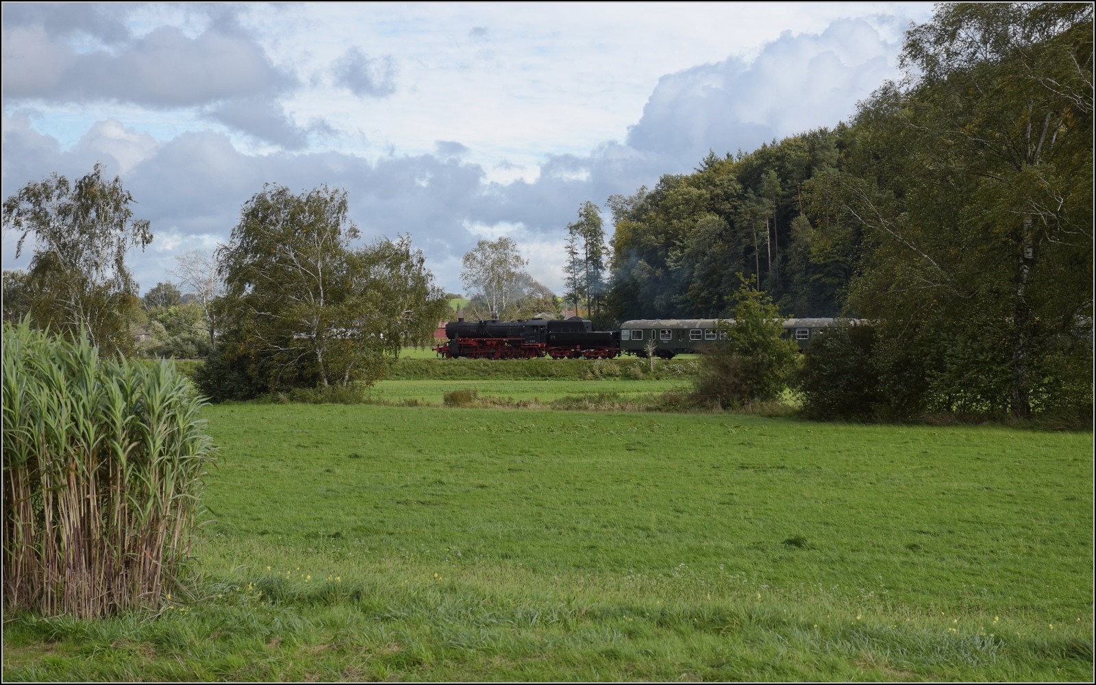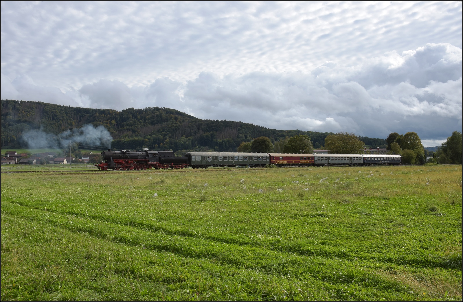 52 7596 mit ihrem EFZ-Sonderzug für die SEHR & RS bei Rüte, im Hintergrund der Schweizer Teil des Schienerbergs mit ein paar für die Anwohner komplizierten Grenzverläufen. Oktober 2022. Olli