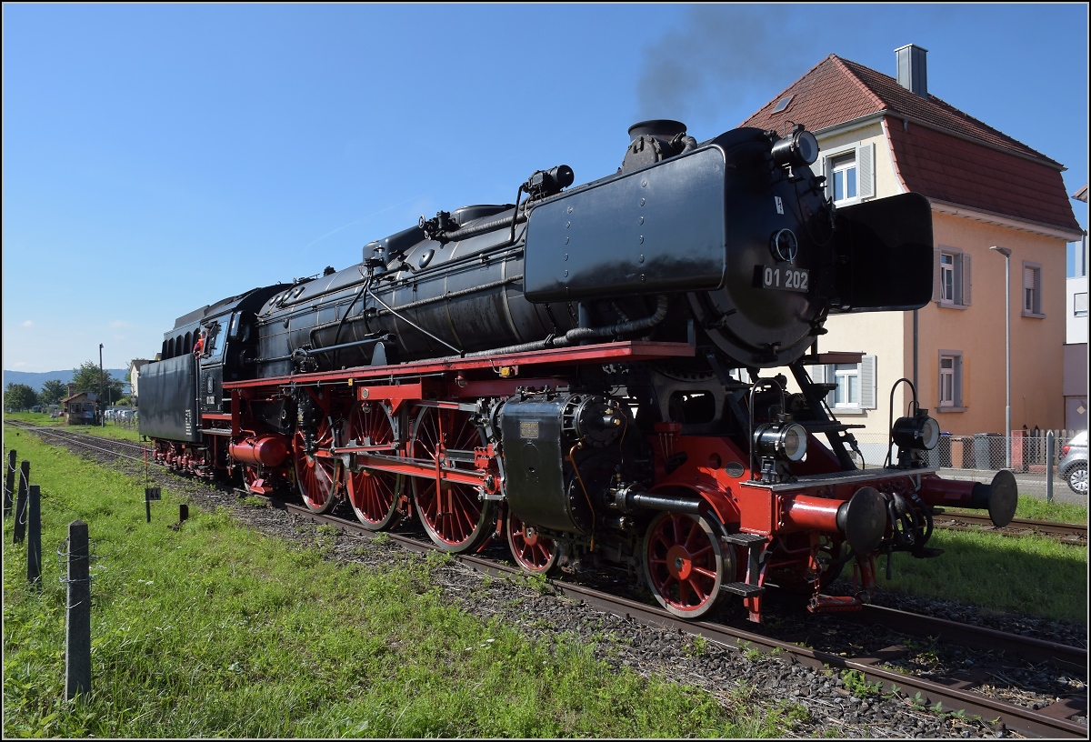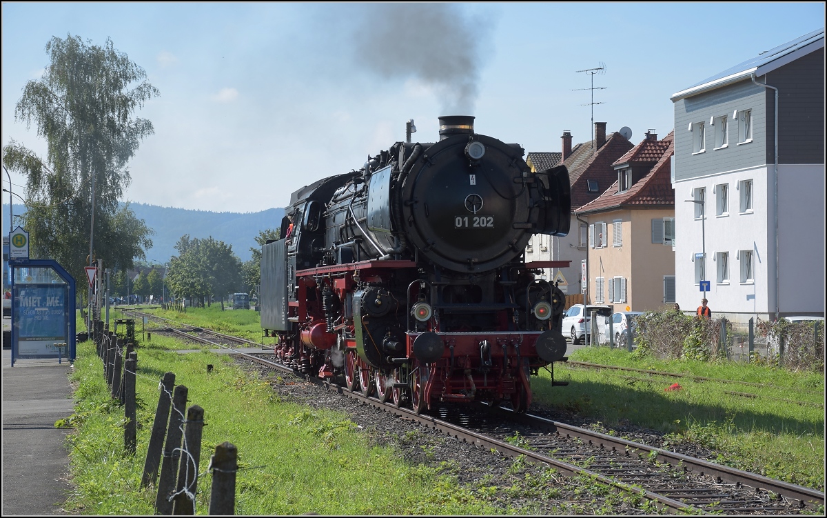 Endlich wieder Züge auf dem Schweizerbähnle (Etzwilen-Singen). 01 202 bestreitet die erste Fahrt im Kreisverkehr auf dem neuen Gleis, der Lückenschluss ist vollbracht. Singen, August 2020. Man beachte auch die Kreis-Verkehrswacht... pardon hier Kreisverkehrs-Wacht.