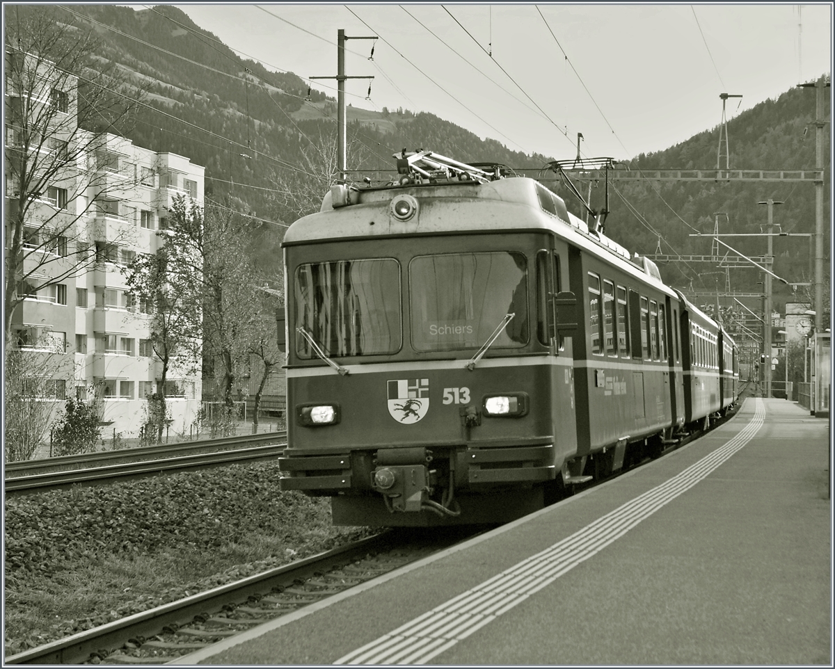 Der RhB Be 4/4 513 erreicht, auf dem Weg von Thusis nach Schiers, den Vorortsbahnhof Chur Wiesental.
