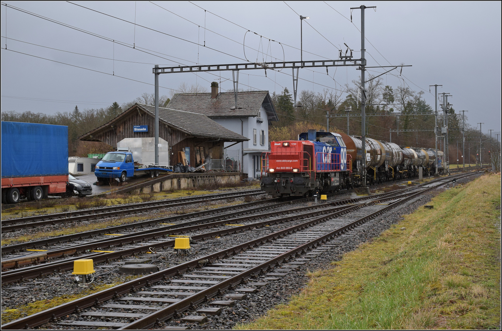 Die etwas bleiche SBB Infra Am 843 003-5 bei der Durchfahrt in Rivaz.