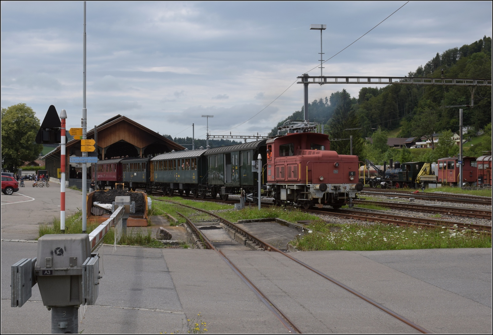 Von den drei BAM MBC Rangierloks wurde die Te 2/2 III 147 nun auch aufgebügelt und fährt nun weg, um den Kieszug von Gland Apples über die Rollbockanlage zu schieben.