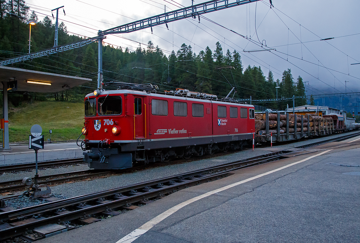 Und siehe da, es kam doch ein Güterzug: Die RhB Ge 6/6 II 706 "Disentis/Mustér" kommt am 12.09.2017 um 19.30 Uhr mit einem Güterzug im Bahnhof Pontresina an. Armin Schwarz