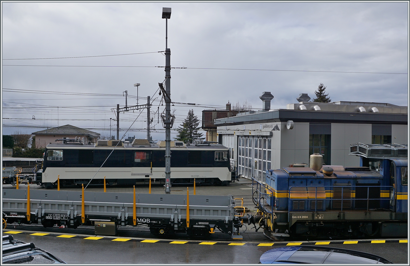 Die MOB GDe 4/4 6002 wartet mit zwei neuen vierachsigen Flachwagen auf dem Streckenast von Chamby in Blonay auf die Weiterfahrt.