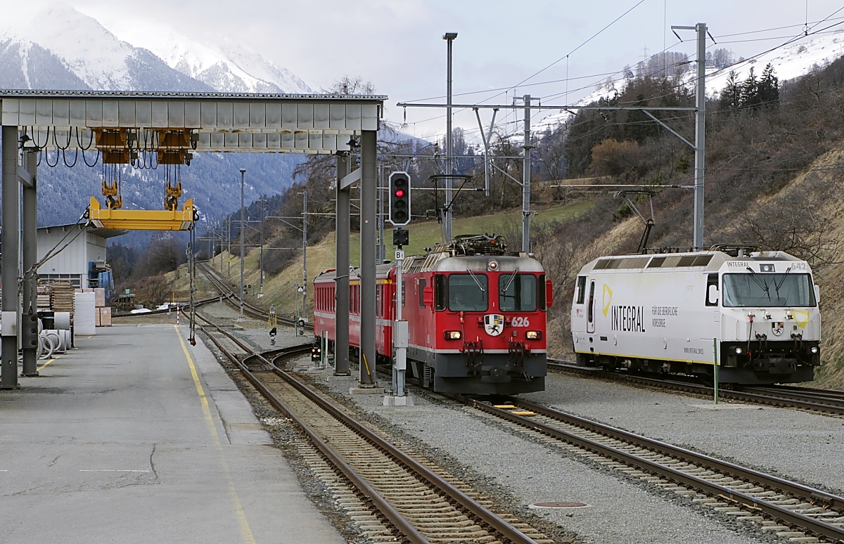 Die beiden BAM MBC Ge 4/4 stossen ihrem Zug Apples - Gland in Morges auf die Spurwechsel- Anlage, bzw. die Wagen wechseln von den zurückbleiben Rollböcken auf die Normalspurgleise.