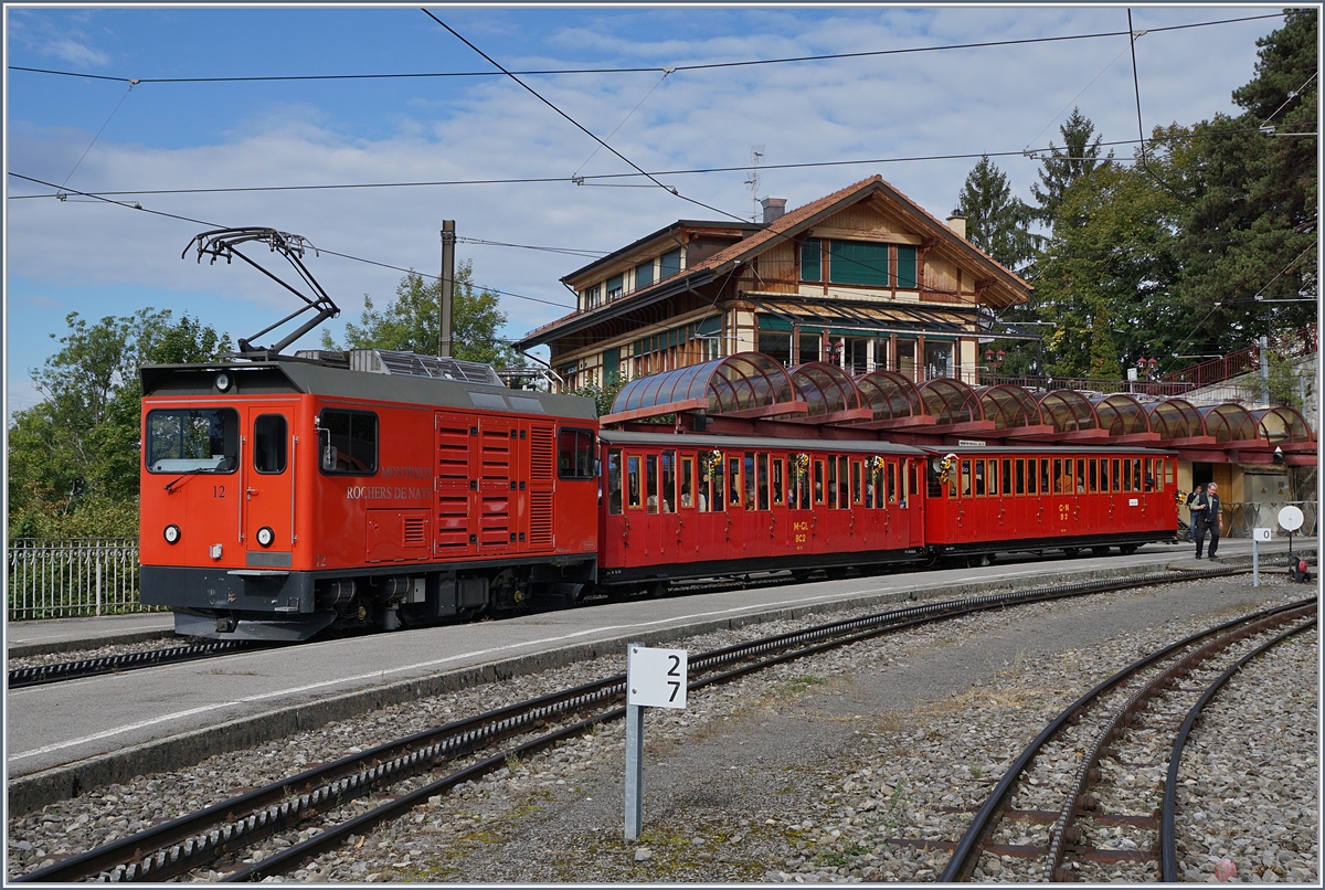 125 Jahre Glion Rocheres de Naye - Die moderne Hem 2/2 N° 12 am 16.09.2017 mit den "Belle Epoque Zug" gerade wieder in Montreux an.