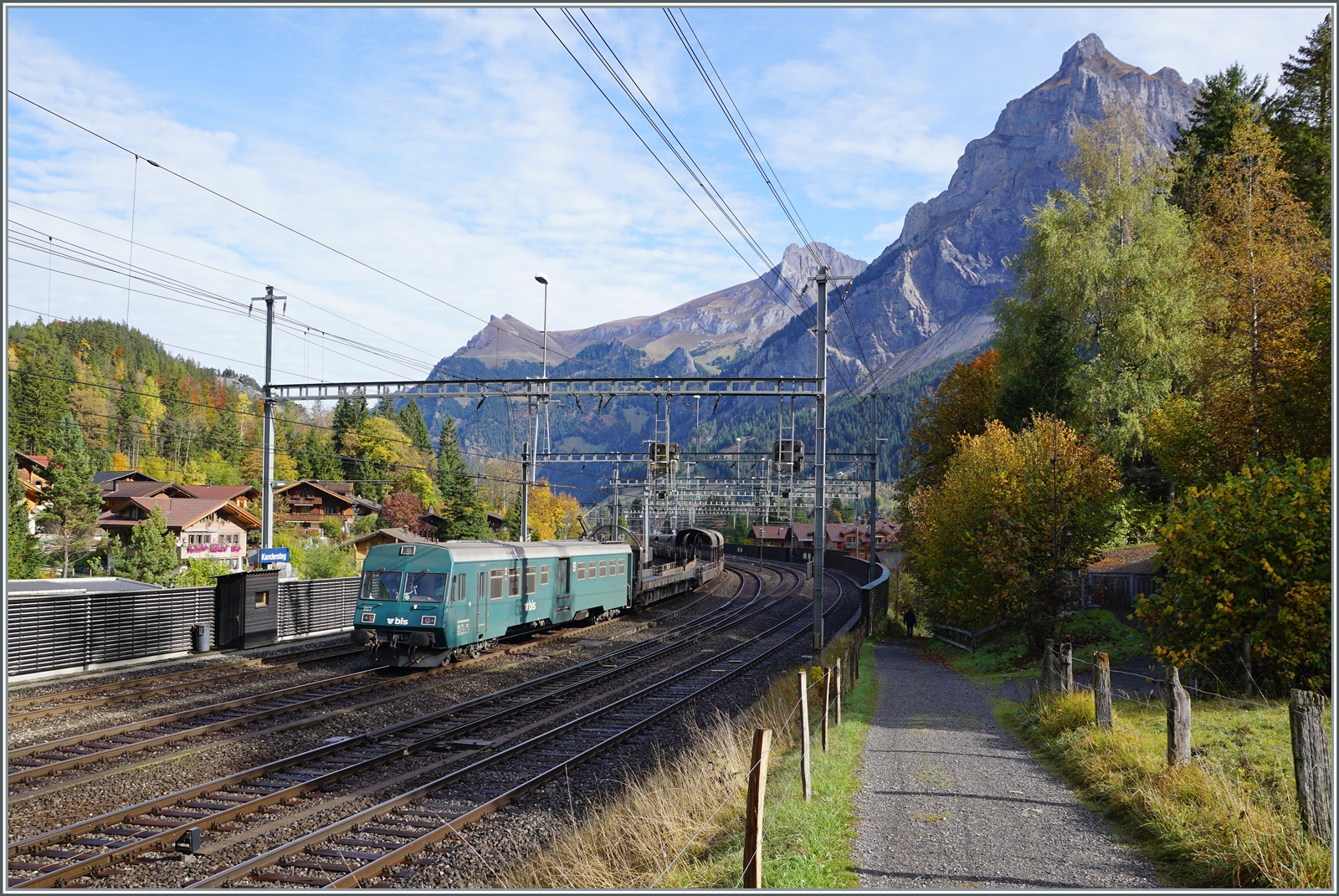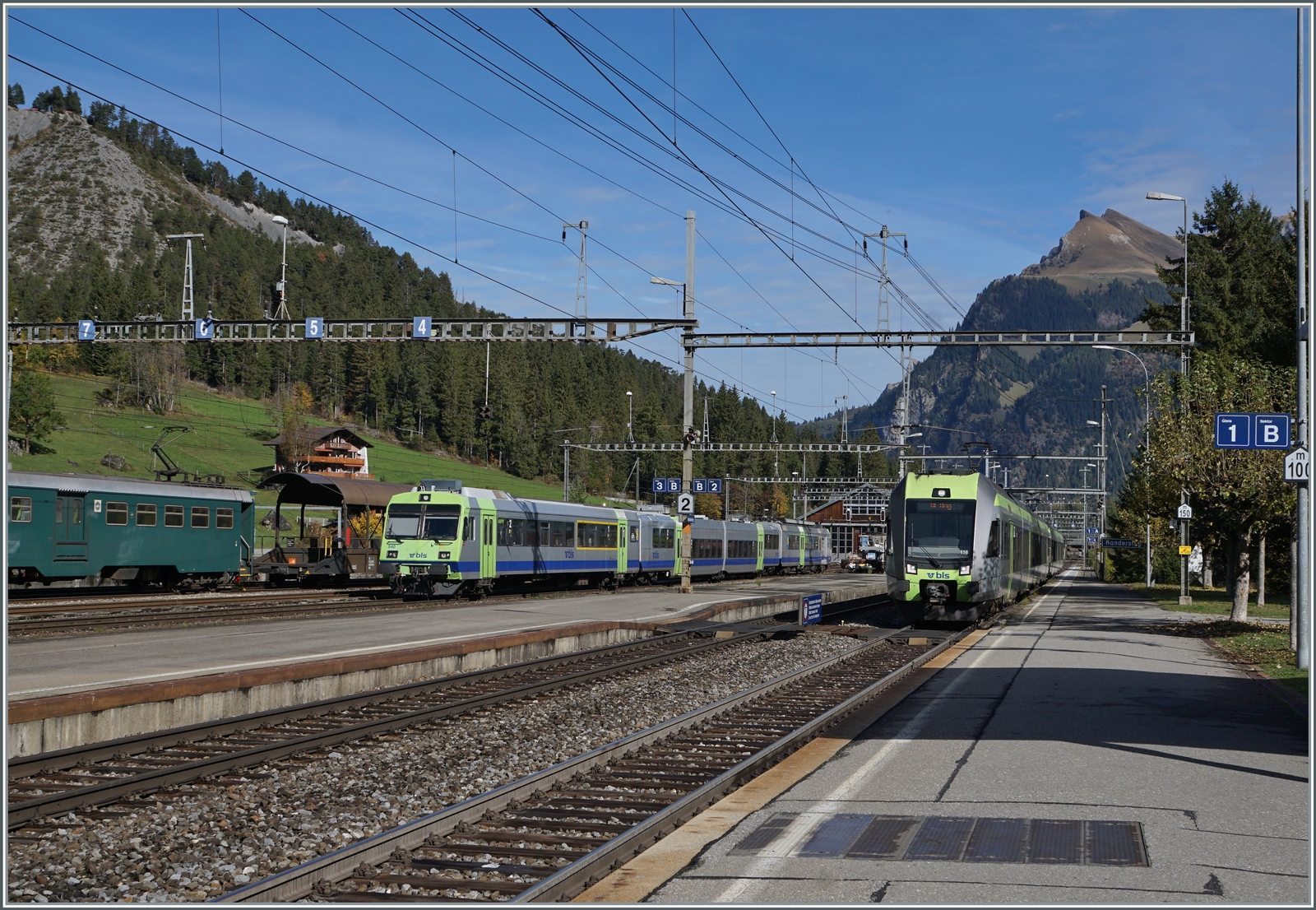 Damit man die von Peter angesprochene "leidige grüne Farbe" der BLS Ae 4/4 besser vorstellen kann, habe ich die Ae 4/4 251 in Kandersteg beim "100 Jahre BLS" Nordrampenfest etwas in die Zeit zwischen 1949 - 1955 (?) zurückversetzt. Zudem "fährt" die Lok hier optisch in die falsche Richtung (auf den Betrachter zu und nicht von im weg).
