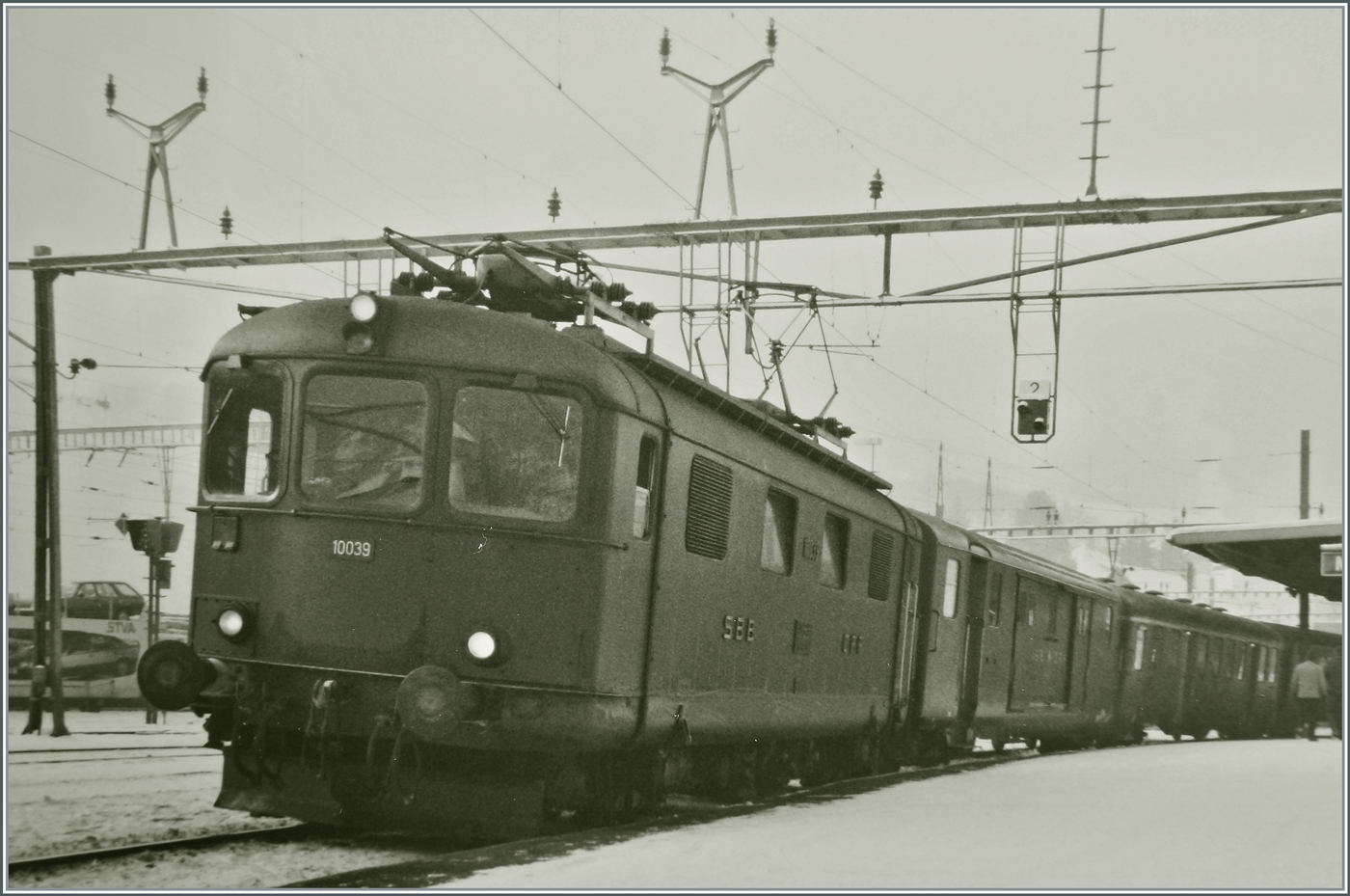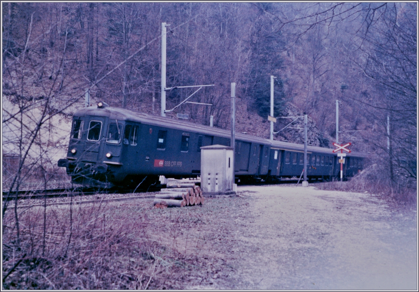 Die SBB Re 4/4 II 11232 wartet nach der Übernahme des "Hispania"- Express nach dem Fahrtrichtungswechsel in Delémont auf die Weiterfahrt nach Basel. Der Zug besteht aus zwei Teilen: dem IC/EC Hispania von Genève nach Hamburg und dem Nachtzug Port-Bou bzw. Cerbère - Basel (-Hamburg).