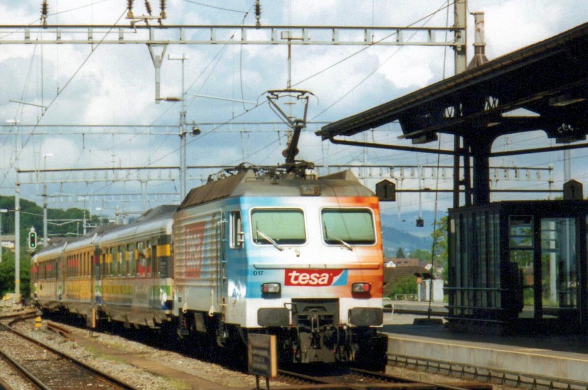 Eine SBB Re 4/4 IV mit einem Schnellzug Richtung Bern (auf dem Bild ist davon nur ein verdeckter Postwagen zu sehen) in Brig.