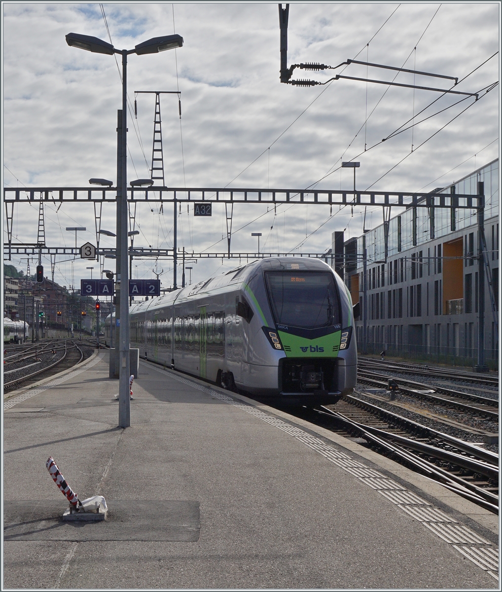 Die Re 465 001-6 "Simplon/Sempione" (91 85 4465 001-6 CH-BLS) mit Werbung "Mehr durch Zug - 10 Jahre Lötschberg-Basistunnel" der BLS wird am 18.05.2018 mit einem EW III-Pendelzug (RegioExpress Neuchâtel – Bern) im Bahnhof Neuchâtel bereitgestellt.