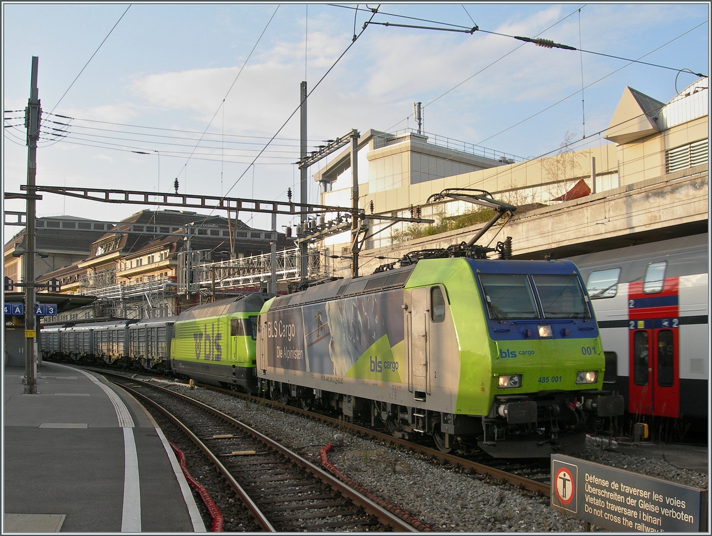 Der Traxx 1 Re 485 009 der BLS mit einer RoLa nach Süden. Schliengen, Dezember 2017.
