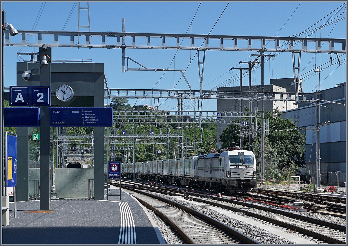 Die Rail Care Rem 476 454 (UIC 91 85 4476 454-9 CH-RLC) ist nach der Fahrt nach Vufflens la Ville mit ihrem Coop-Container-Zug wieder zurück in Genève, hier erreicht der Zug bei Lancy Pont-Rouge den Güterbahnhof Genève La Praille. 19. Juni 2018