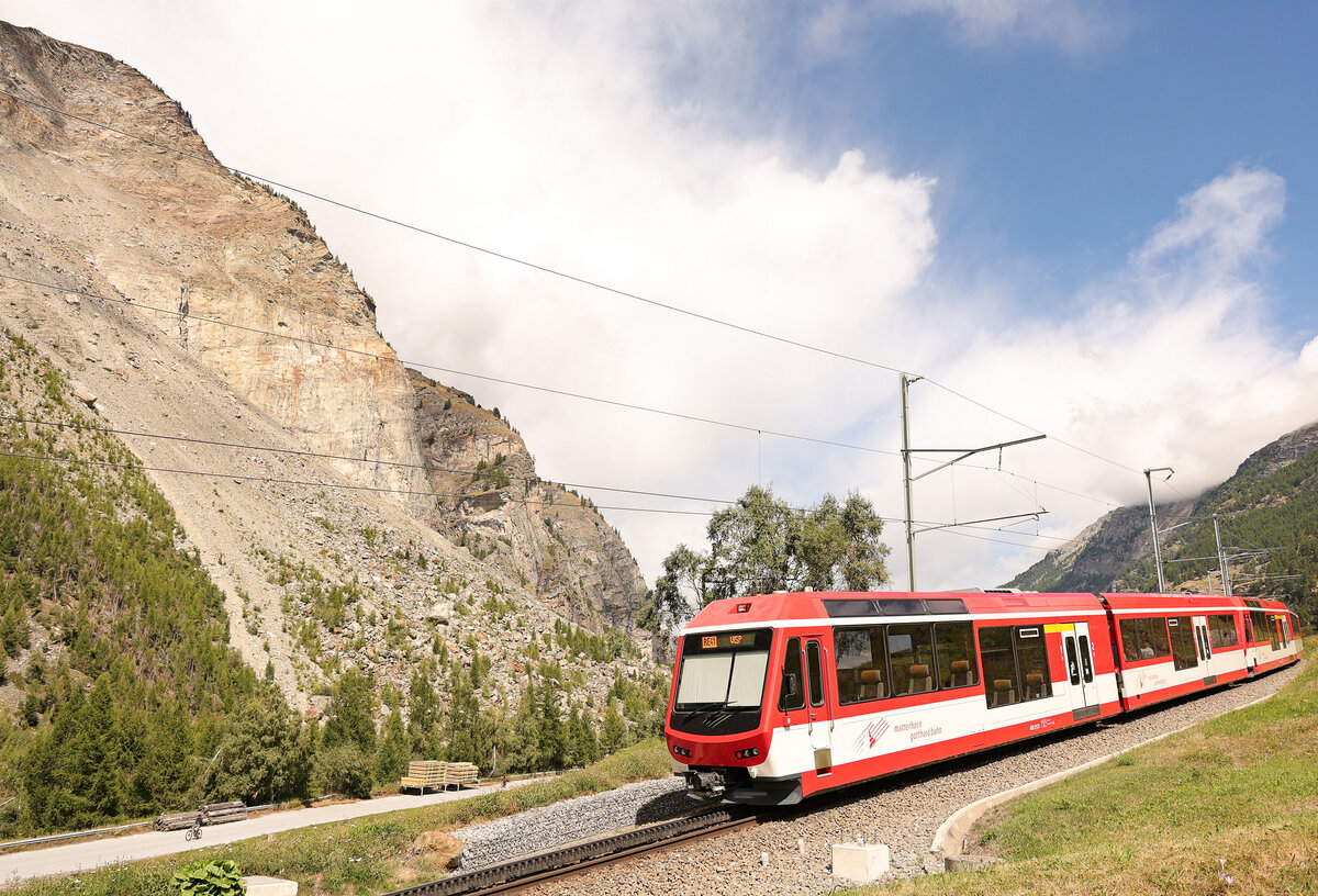 Der MOB GoldenPass Panoramic 2115 mit führendem Ast 117 überquert die 109 Meter lange Grubenbach Brücke kurz vor der Ankunft in Gstaad.