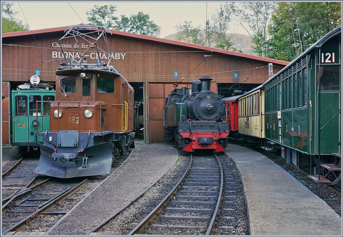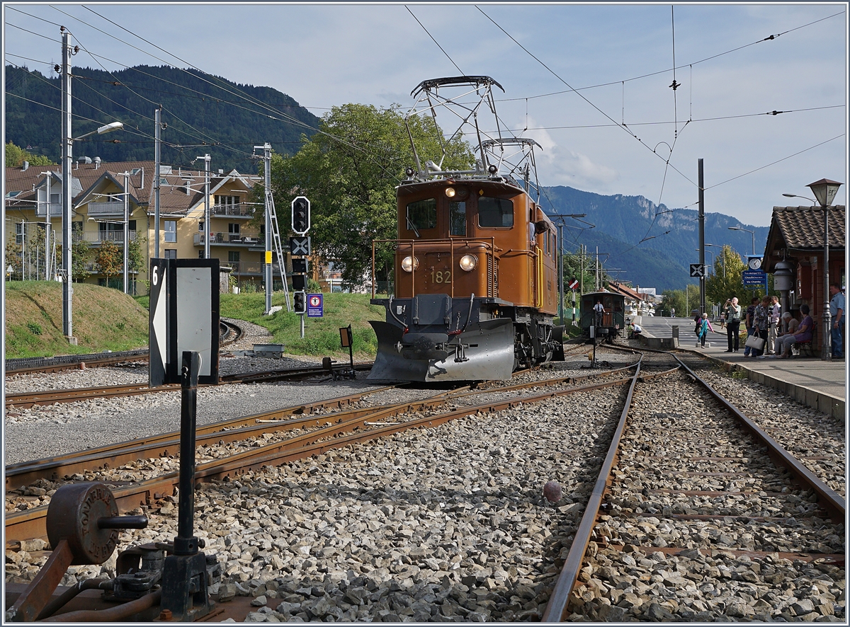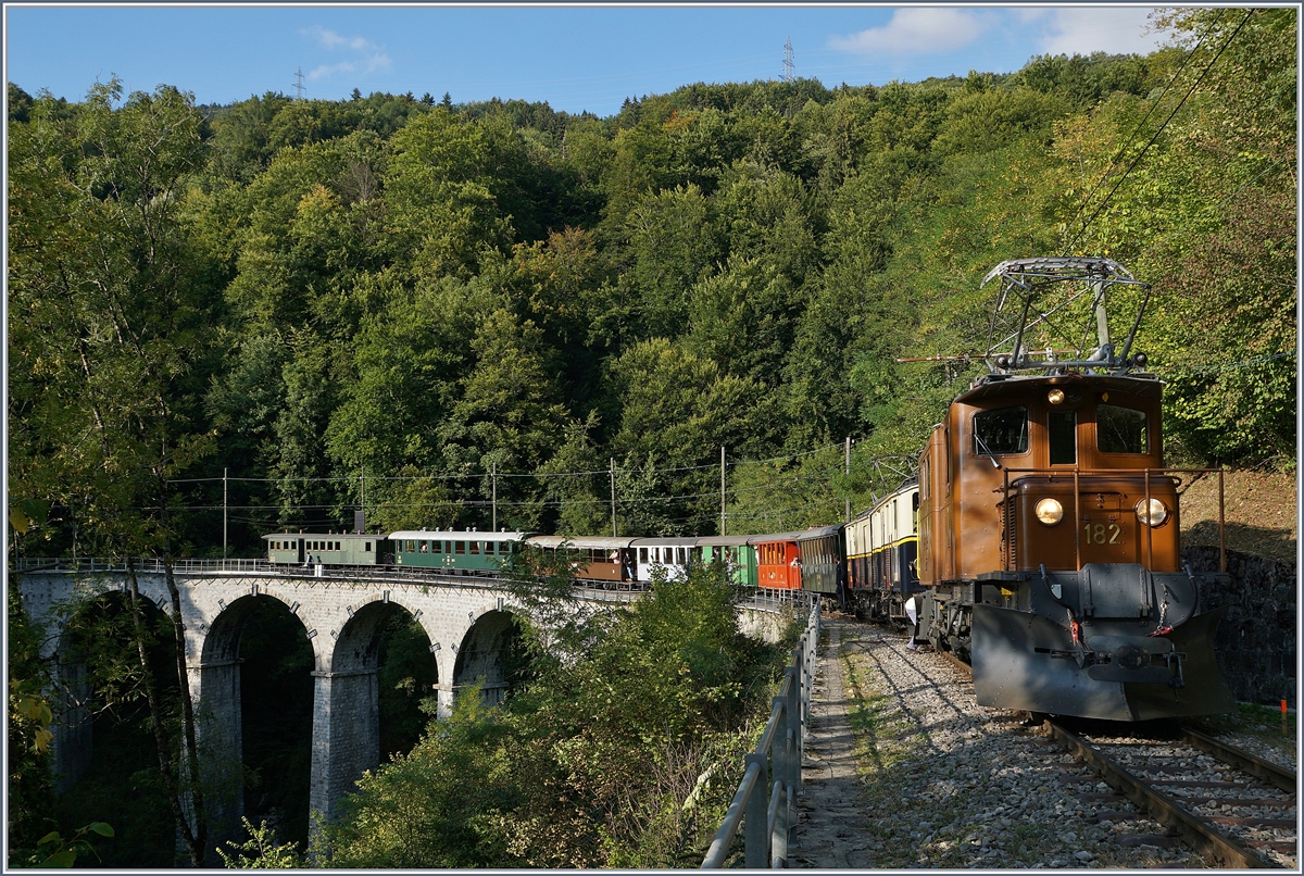 50 Jahre Blonay Chamby - MEGA BERNINA FESTIVAL: Das Bernina Krokodil Ge 4/4 182 erreicht mit einem hübschen, kurzen Zug bei "Vers-Chez-Robert" den Baie de Clarens Viadukt.