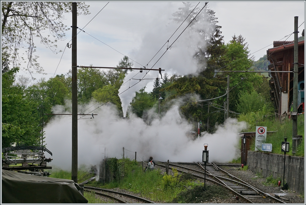Nostalgie & Vapeur 2021 /Nostalgie & Dampf 2021: Die Blonay-Chamby RhB Bernina Bahn Ge 4/4 81 zauberte etwas Landwasserviadukt in Waadtland, als sie mit ihrem Regionalzug von Blonay nach Chaulin den Baye de Clarens Viadukt überquert hatte und nun der Schucht entlang Richtung Chamby fuhr.