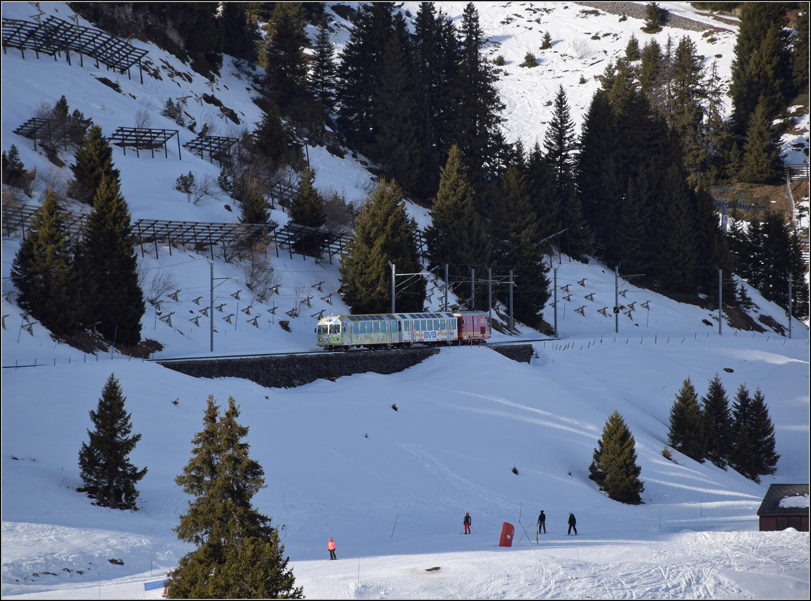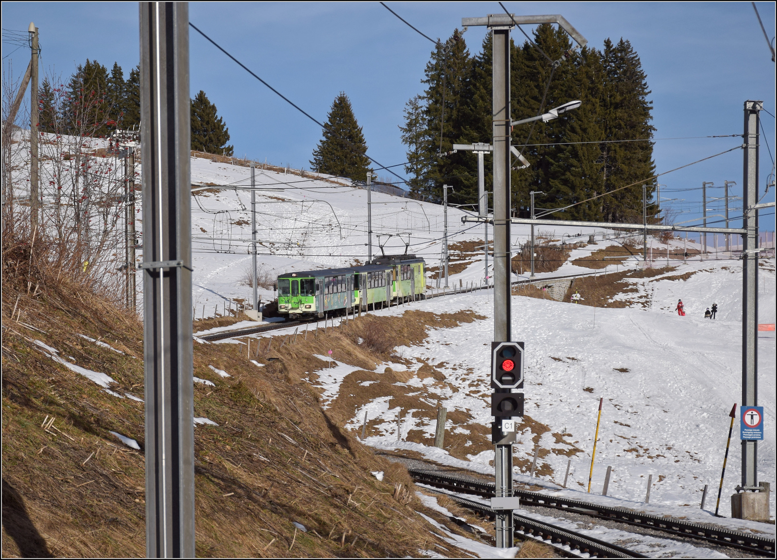 Der BVB Be 2/3 15 im TPC Farbkleid besorgt in Villars das Manöver.