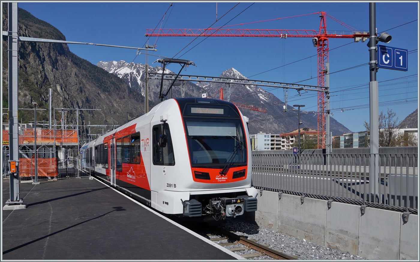 Im neu gestalteten Bahnhof von Martigny (TMR) ist der neue TMR Beh 4/8 91 bzw. SNCF 891 (90 85 838 0891-4) auf einer Testfahrt. Leider fuhr der Zug nur knapp bis hinter das Ausfahrtsignal statt bis zum Prellbock, so dass dieses Bild nicht ohne störende Elemente zustande kam. 9. April 2026 Stefan Wohlfahrt