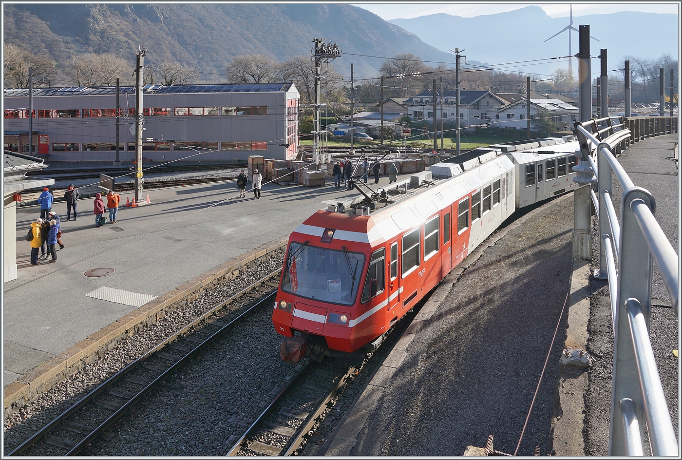Während dem Umbau des M-C Bahnhof in Martigny wurde die Strecke Vernayaz M-C Martigny im SEV bediente und die TMR Züge starteten oder endeten in Vernayaz M-C. Das war einerseits eine gute Gelegenheit die nun dort etwas länger stehende Züge zu fotografieren, andererseits aber auch mit der Erfahrung verbunden, dass es in Vernayaz M-C gar nicht so einfach, die Züge ins Visier zu nehmen, besonders, wenn diese auf Gleis 2 stehen, wie diese Bild des TMR BDeh 4/8 N° 21 zeigt.
