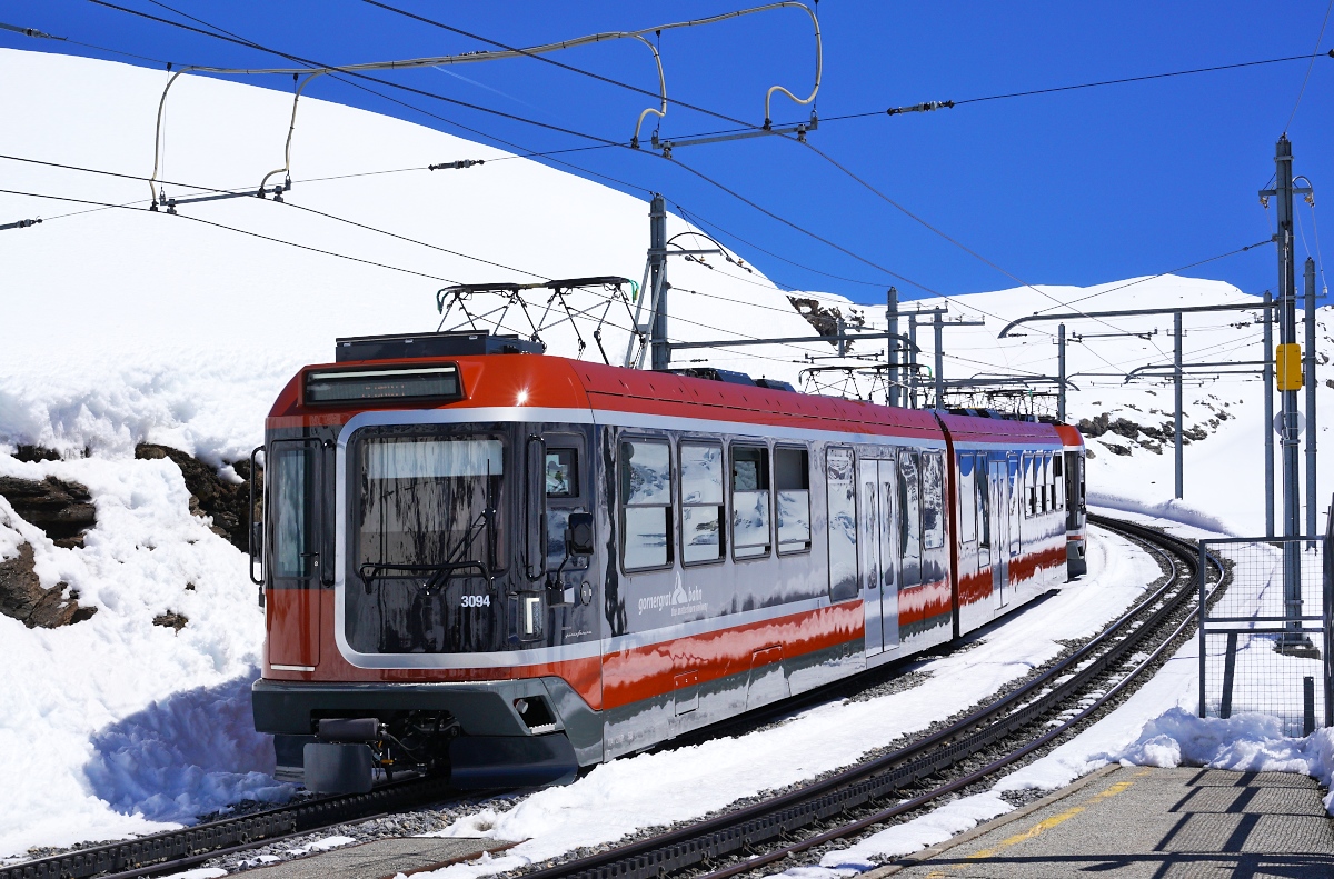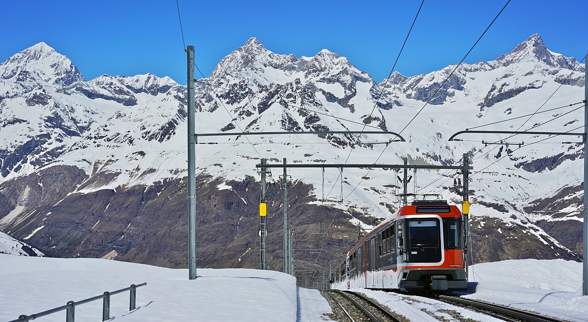 Die Lokomotive He 2/2 14 der Gornergratbahn erwartet den Autofahrer schon an der Weggabelung zwischen Saastal und Mattertal. Mittem im Kreisverkehr kann man schon sehen, was einen früher erwartet hätte. Ein Stück eigenen Fahrdraht hat die kleine Drehstromlok schon mitgebracht, interessant die zweipoligen Stromabnehmer. Stalden, Oktober 2017.