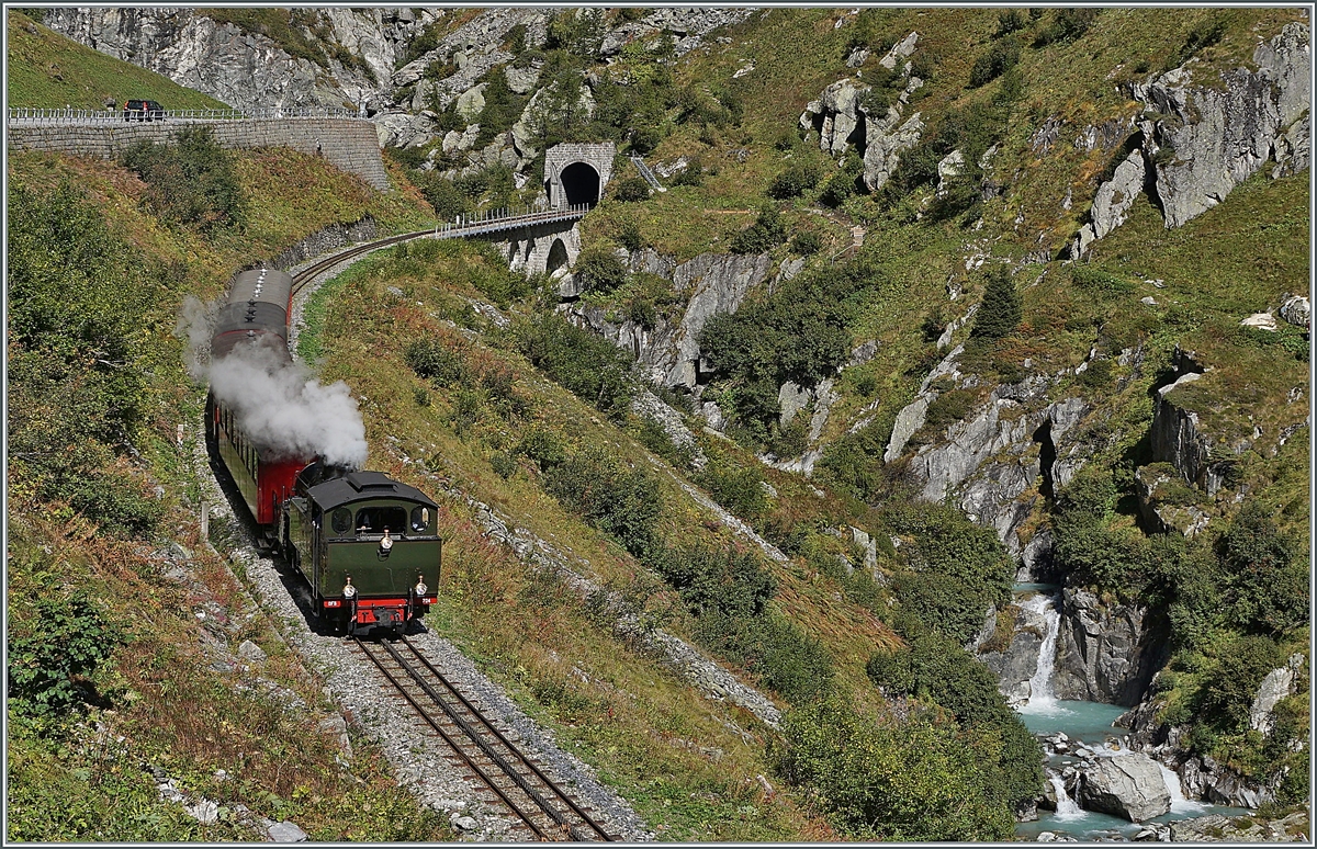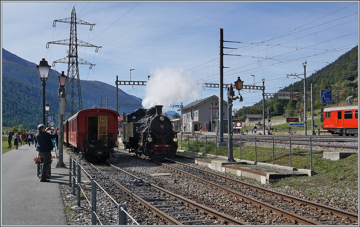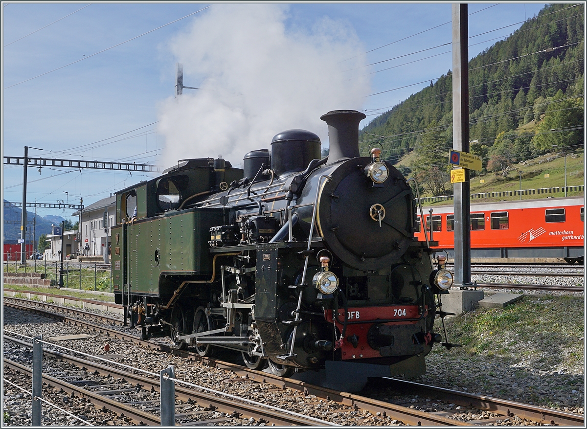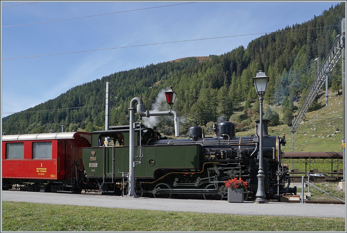 Überraschung in Realp. Schon von weit oben sah man es dampfen. In der Mitte der Woche könnte es sich nur um eine Besonderheit handeln. Unten nähert sich die Vietnamesin HG 4/4 704. Nach wirklich unzähligen Arbeitsstunden war sie kurz vor der Abnahme zu letzten Bremsproben unterwegs. September 2018.