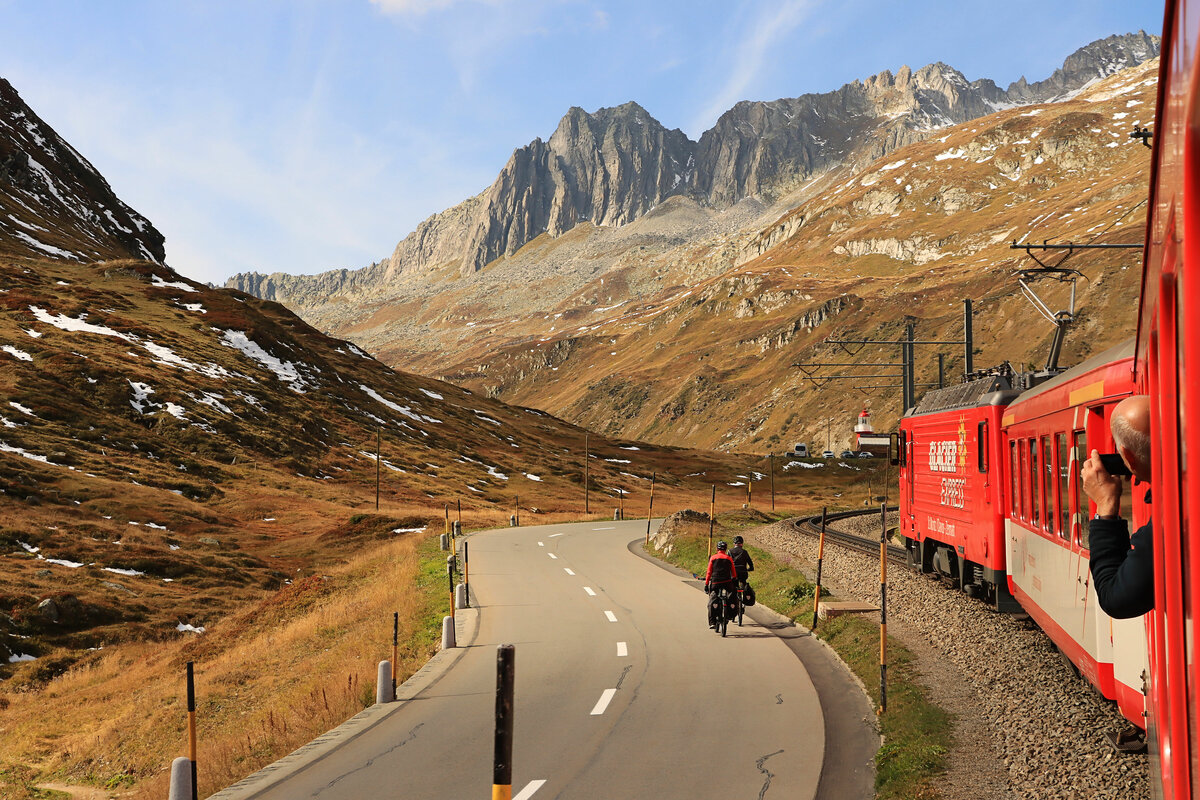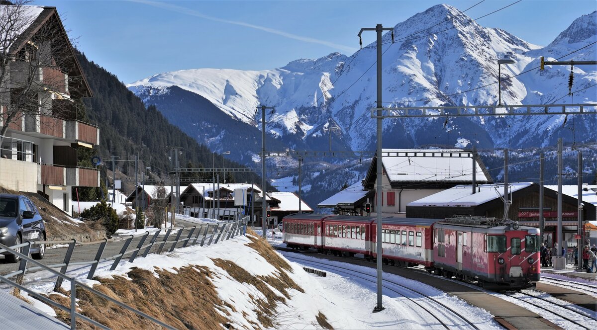 Es schneit, es windet! Andermatt mit Zügen von und nach Disentis. Wie üblich steht die HGe 4/4 II perfekt ungeschikt vor dem Weichensignal - aber bei seinem solchen Wetter hat die MGB natürlich keine Fotografen erwartet...