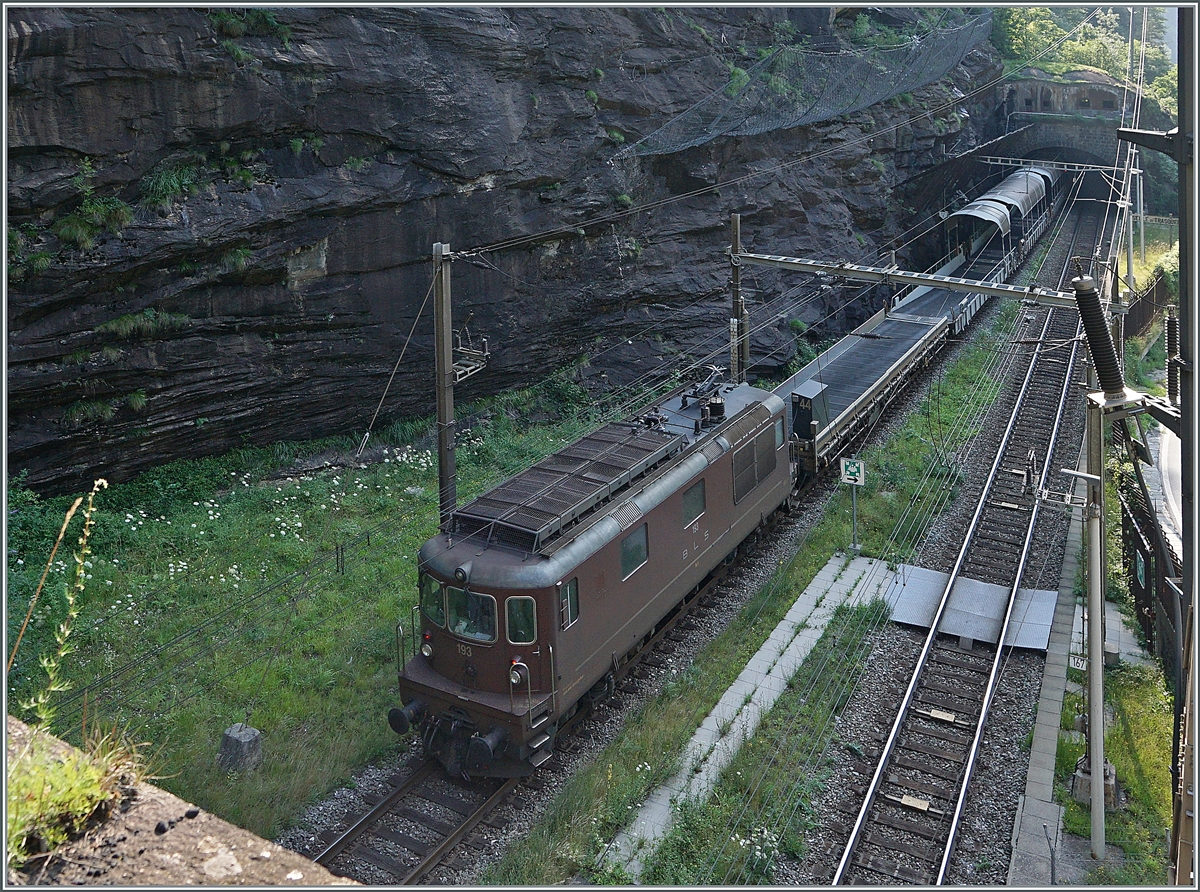 Der BLS Tunnelautozug nach Brig verschwindet in Iselle im 169 Meter langen "Tunnel von Iselle", am Schluss des Zuges ein BLS Steuerwagen .