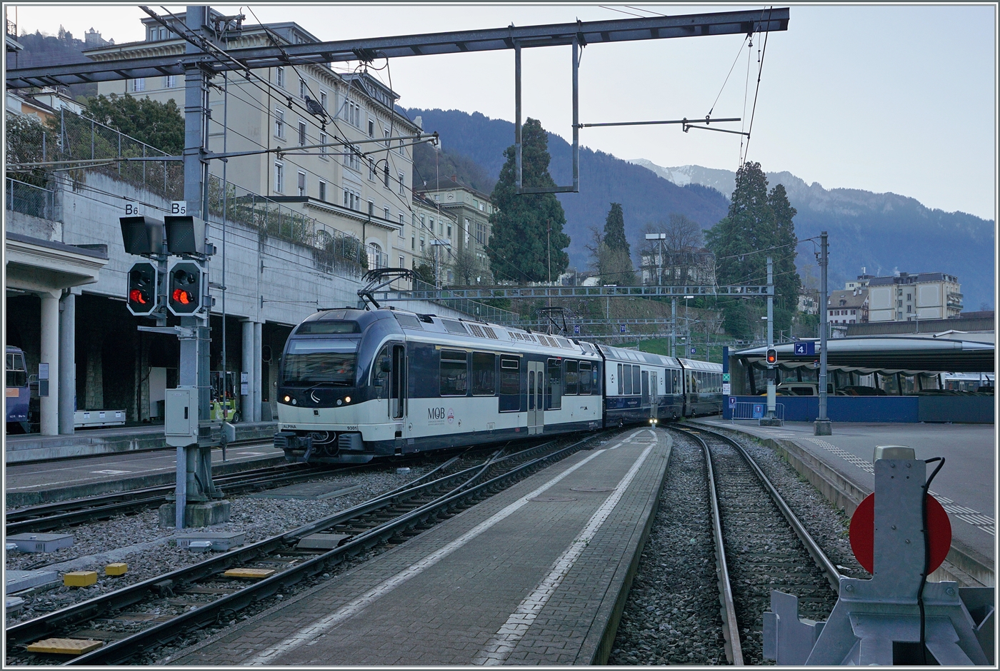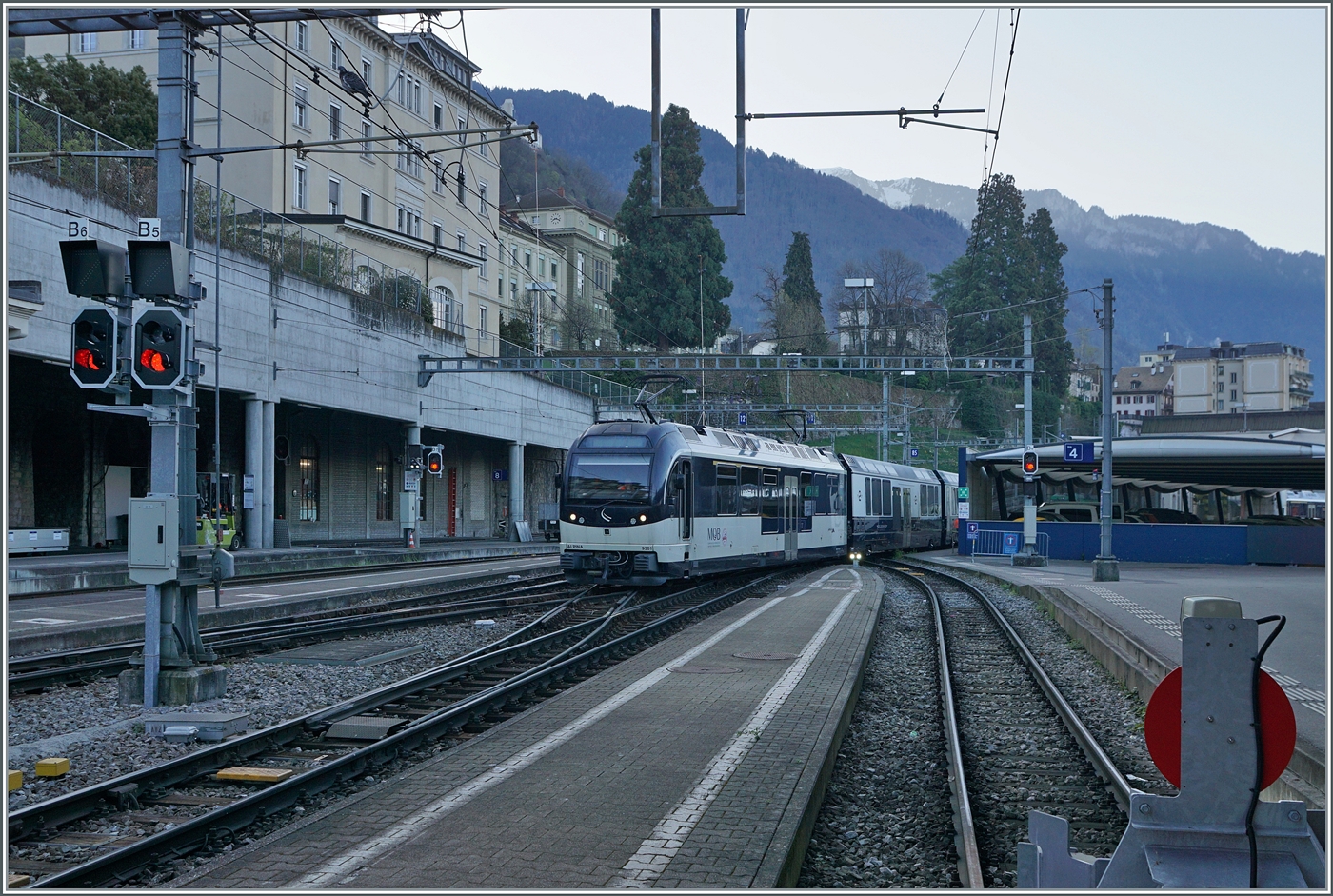 Blick auf den Bahnhof von Apples mit einem Regionalzug von Morges nach Bière. Die Strecke im linke Bildteil führ nach L'Isle.